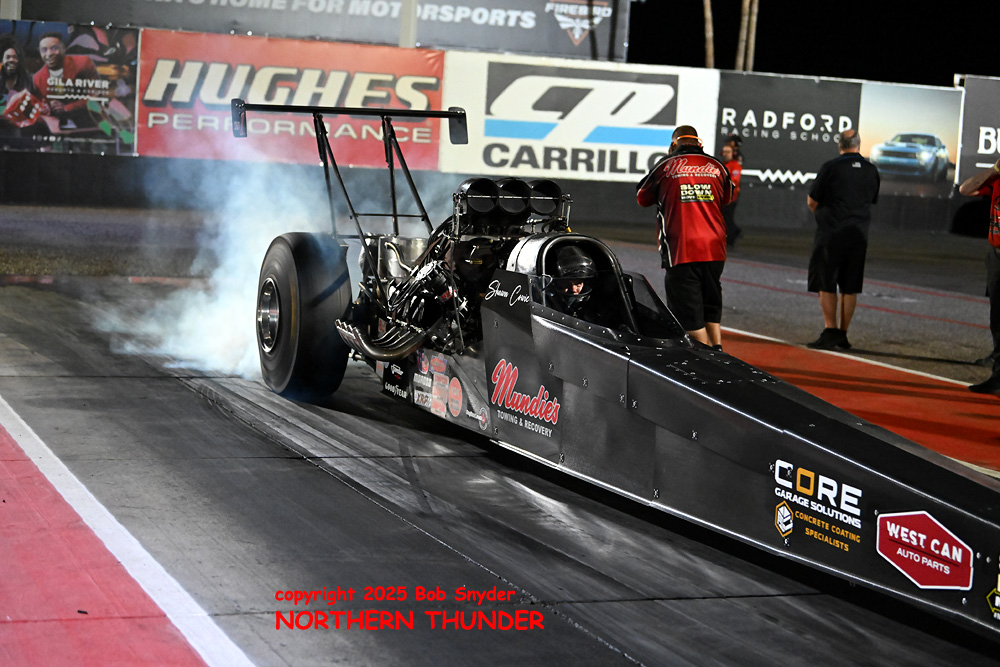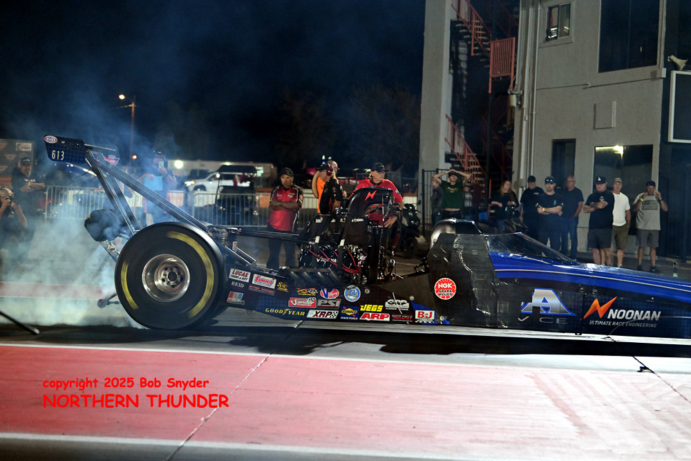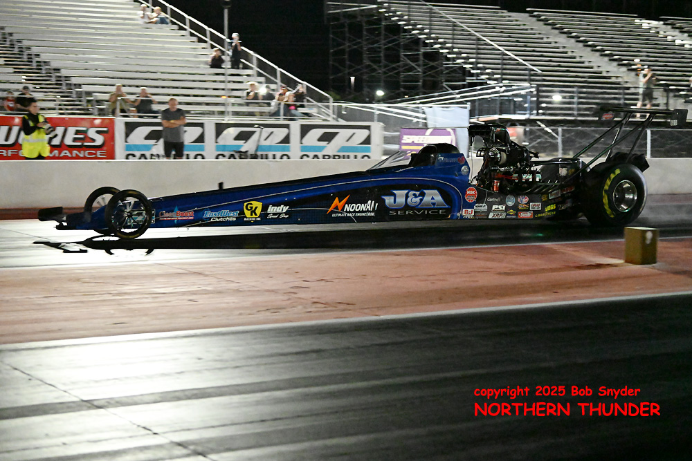 The final pair of the round featured the top racers in the points standings, with defending champion - and current leader - Shawn Cowie (not shown) matched up against his only real challenger for the 2025 championship, Joey Severance. He pounded out a new low e.t. of the evening, with an excellent 5.233 - 277.03 to put a sizeable margin between him and the rest of the field. However, only half a tenth back was Cowie with a nearly as good 5.281 - 271.73 effort.