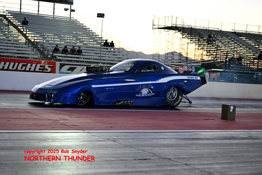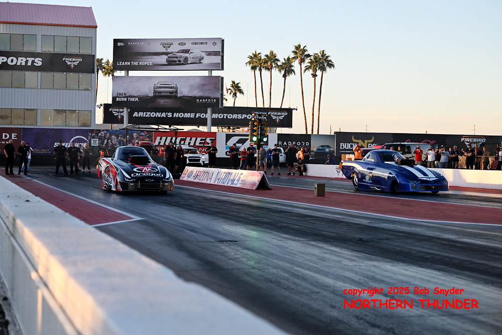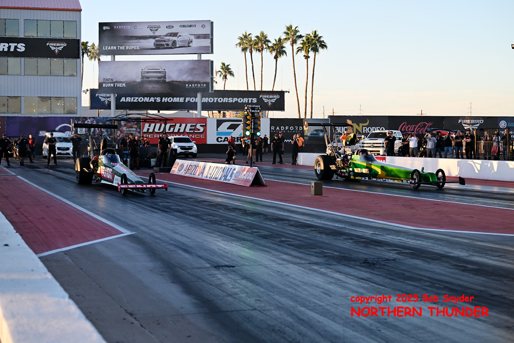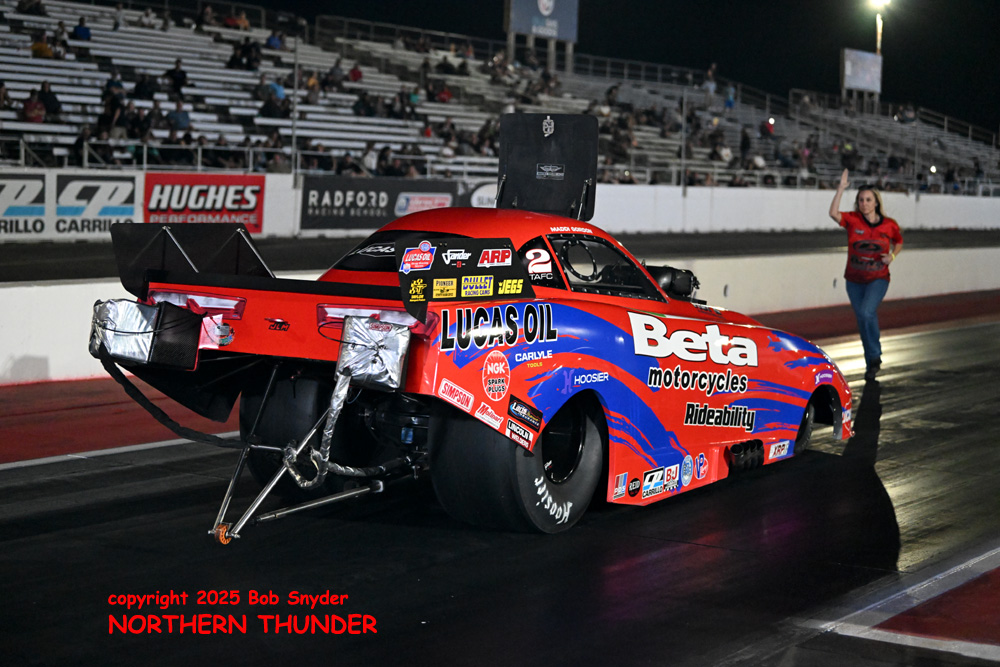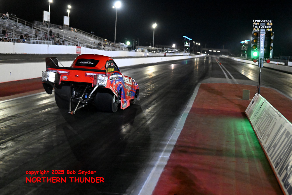 (RIGHT) When the lights came on more than two hours later, the next pair up had Taylor Januik facing Shaunda Blinzler, not shown due to a lack of lighting on her side of the track. Neither driver was able to run quicker than Austin, but Januik came closest with a solid 5.389 - 274.11, while Blinzler trailed with her decent 5.429 - 266.37 clocking. Unfortunately for the Blinzler team, they hurt the engine and weren't able to appear on Saturday.