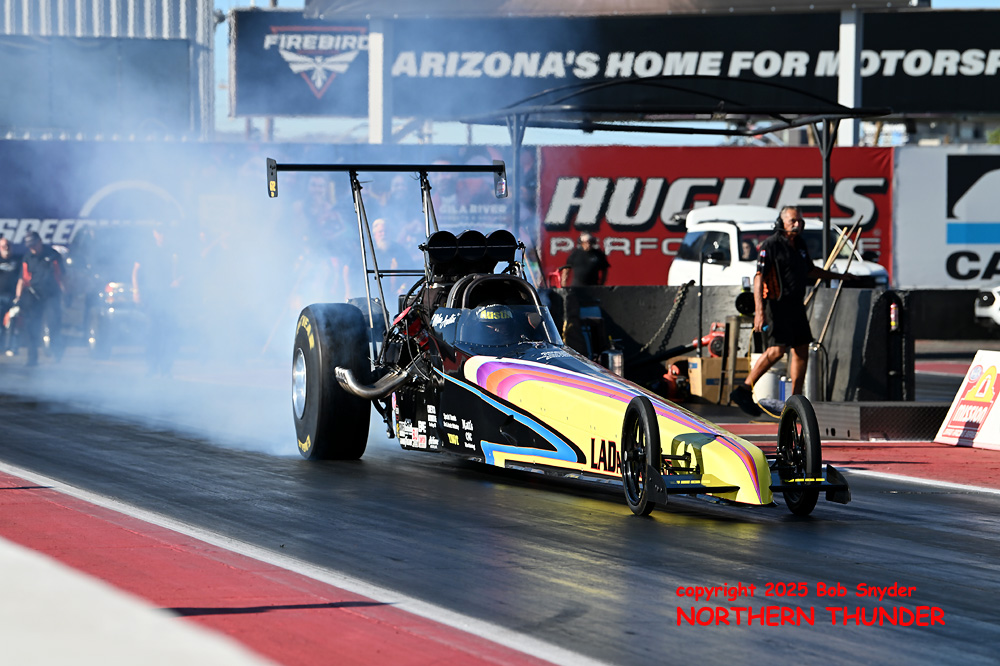 (RIGHT) Having much better luck as she neared the end of her short - but very successful - Top Alcohol career, Maddi Gordon put down a very good 5.600 - 262.04 to grab the top spot on the ladder.