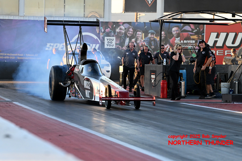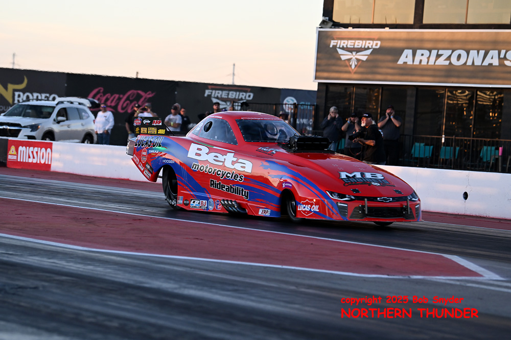 We have no idea whether there were a lot of planned early shutoffs, or if the racers were trying different setups, but this evening's qualifying sessions, at 6pm, 8pm, and 10pm should see some seriously competitive numbers coming from most of the teams. We've seen the "live timing" results on the NHRA website, but there were almost no names posted, and in some cases, the car numbers didn't really seem to match up with the racers that would be expected to be seen at the Phoenix-area track.We stand to be corrected, and almost certainly will be, but here are the names we could deduce from the NHRA timing page.