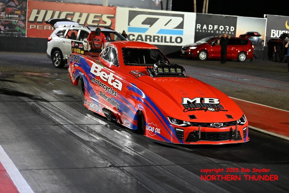 It's not a full-on Divisional race, with all the Sportsman categories, but it is what could prove to be a pivotal event in the chase to the 2025 NHRA Championships for the Top Alcohol categories. There is an supporting cast of the Super classes (Comp, Gas & Street), along withn 1320 Outlaws and Jet Cars, but the focus is clearly on the blown alky and injected nitro classes. Yesterday saw a test-n-tune session for them, with varying results. While none of the dragsters broke the 9-second barrier, there were a couple of 5-second passes by the Funny Cars.