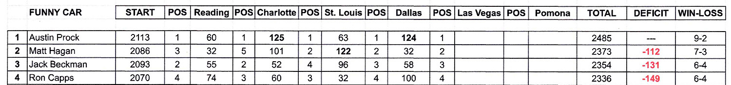 Similarly to Top Fuel, the points gap in Funny Car widened considerably at the FallNationals. Leader Austin Prock opened a huge gap over #2 Matt Hagan, going from 20 to 112 points ahead, courtesy of Prock's event win and Hagan's first round loss. The #3 and #4 racers, Jack Beckman and Ron Capps, respectively, fell further back. Beckman dropped another 66 points in arreears, while Capps went to the final round and only dropped 24 points further behind. After the top four, the resurgent Daniel Wilkerson is teetering on the contention precipice, despite three straight semifinal finishes in the countdown. He's 189 points out of the top spot and it's a "slim and none" proposition for Team Wilk.