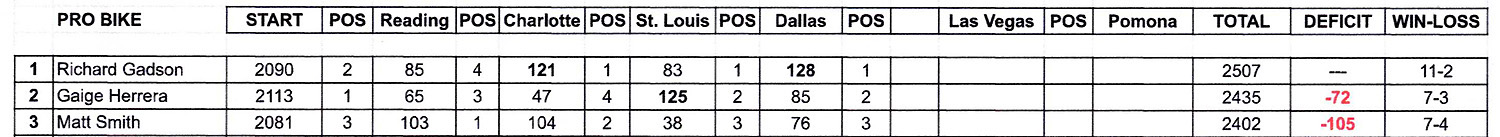 Courtesy of his second event win in three races, Richard Gadson put some distance between himself and closest pursuer Gaige Herrara. Gadson went from 29 points in front to 72, and in the #3 spot, Matt Smith fell even further, going from 53 points back to 105 and in danger of dropping out of contention. Below him, the odds get much longer, much quicker, with #4 Brayden Davis already 186 points out of first place, despite two consecutive final round appearances. And at the bottom of the Top Ten, the #9 and #10 riders are already done, mathematically.