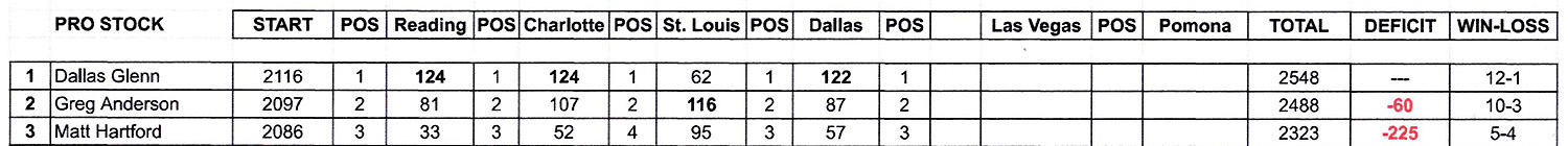 While that's far from an insurmountable margin, the pressure is squarely on Greg Anderson to match wheels with Glenn and not let him widen the lead going into the final race of the season at Pomona. Almost forgotten in third place is Matt Hartford, who has held that position for most of the season, but he's rapidly running out of runway, dropping an extra 65 points behind Glenn. At 225 points out of first place, his championship hopes are almost gone, and below him it's game over for the rest of the countdown contenders, with six of them already out of even a mathematical chance to overtake the leader.