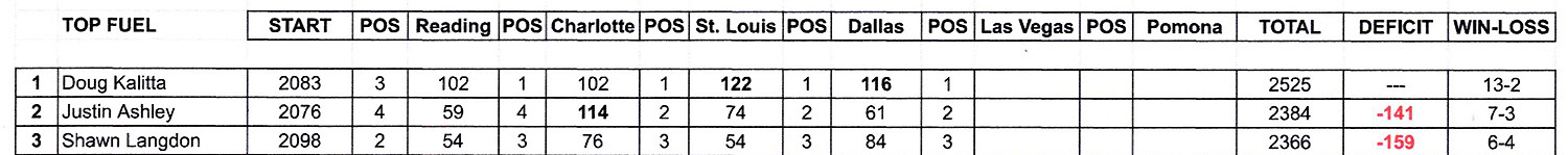 However, the easiest way to look at it is the number of rounds a pursuer would have to win to gain any ground on a leader. With 20 points per round win at Vegas and 30 per round at Pomona, the math gets tighter as each elimination round is completed. And let's not forget the "little points", as eight points for the #1 qualifier, and three points for low e.t. in each round of qualifying can equal a full round win worth of points.