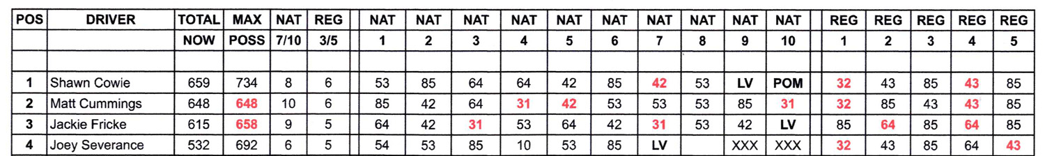 While there are four names on the graphic, the RED numbers indicate that the racer in question is eliminated from contention. So it's down to a two-way battle for the title, with Northwest Division rivals, Shawn Cowie and Joey Severance, duking it out at the final two national events. Since both racers have already used up all their regional events (maximum of five, with the best three results counting), it's down to Las Vegas and Pomona. While Cowie has a 127-point lead going into Las Vegas, Severance has only claimed points at six national events this year, so he would be able to add all points he earns at the Nevada Nationals to his total.