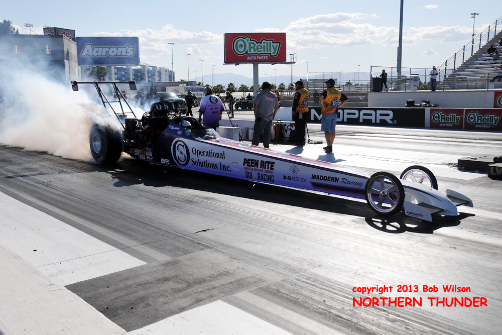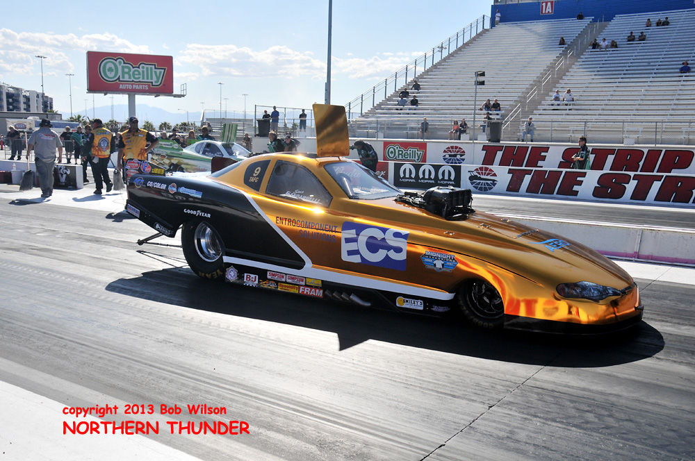 (RIGHT) When the ambers flashed, Drake, (far lane), laid down a rather lazy 6.249 - 235.47, while newcomer Mike Januik posted much better numbers, 5.875 - 246.03, on the scoreboard. Both were career bests for the Las Vegas resident.