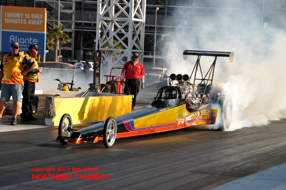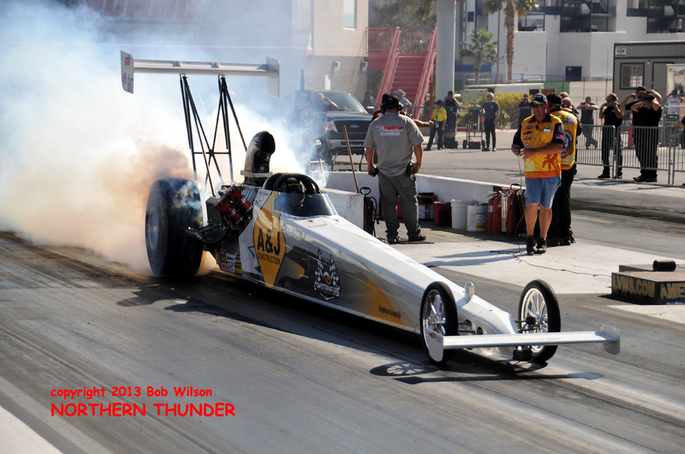Driving an almost blindingly bright chrome paint/wrap entry, second generation funny car racer, Steve Gasparelli showed off in the afternoon sun, but when he launched, the car went barely a car length before the tires lit up, causing him to shut off instantly.