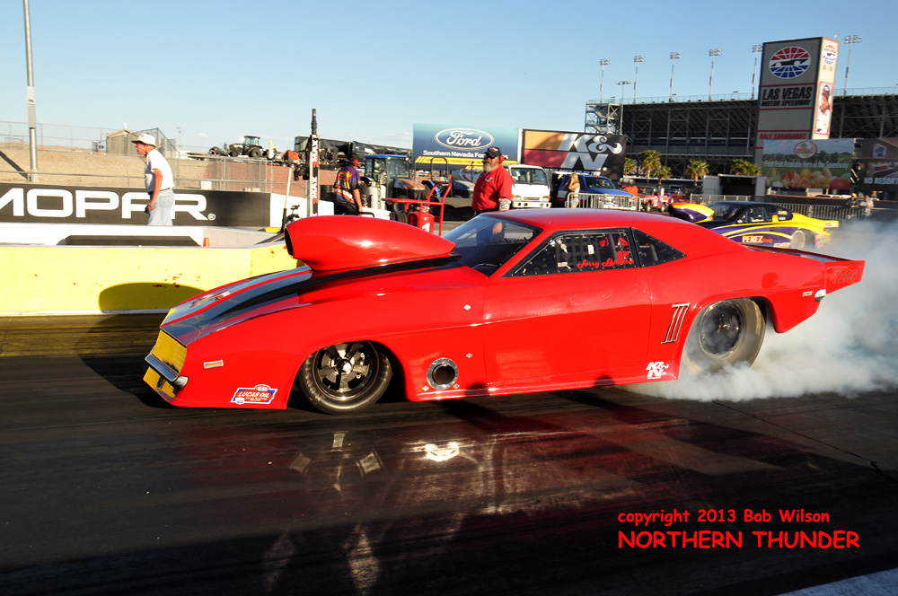 Spray painter Mark "The Woz" Woznichak showed off his artwork with the beautifully coloured Monte Carlo in the burnout and prepping for the run. He launched well, but the engine blew up before the 330' clocks and he failed to register a time.