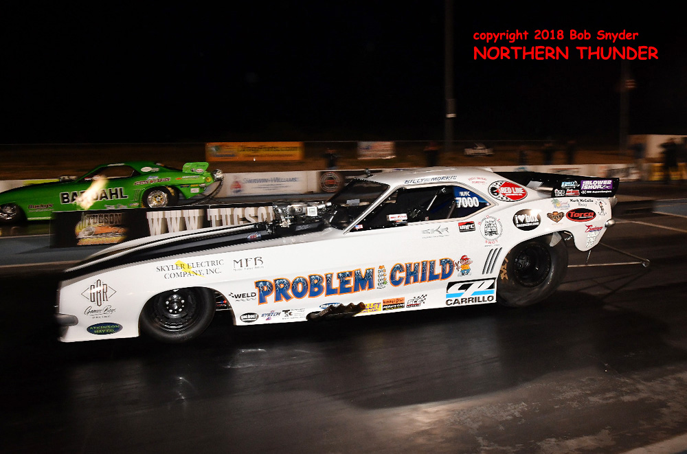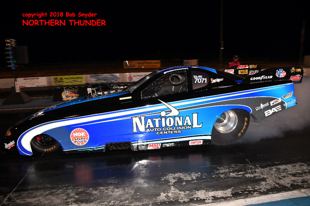 Multi-time series champion (NHRA Heritage and IHRA Nitro Jam) Jason Rupert in the "Littlefield & Rupert" "Rolling Thunder" Camaro put up the best speed of the night at 250.27 mph, coupled with a 5.845 e.t. to outrun Matt Bynum in the "Nitro Nick" Camaro, which cleared the traps at an early shutoff 5.970 - 209.92. Bynum did come back on Saturday afternoon with an excellent 5.825 - 249.49 pass to move ahead of Rupert on the qualifying sheet and take the #3 spot.