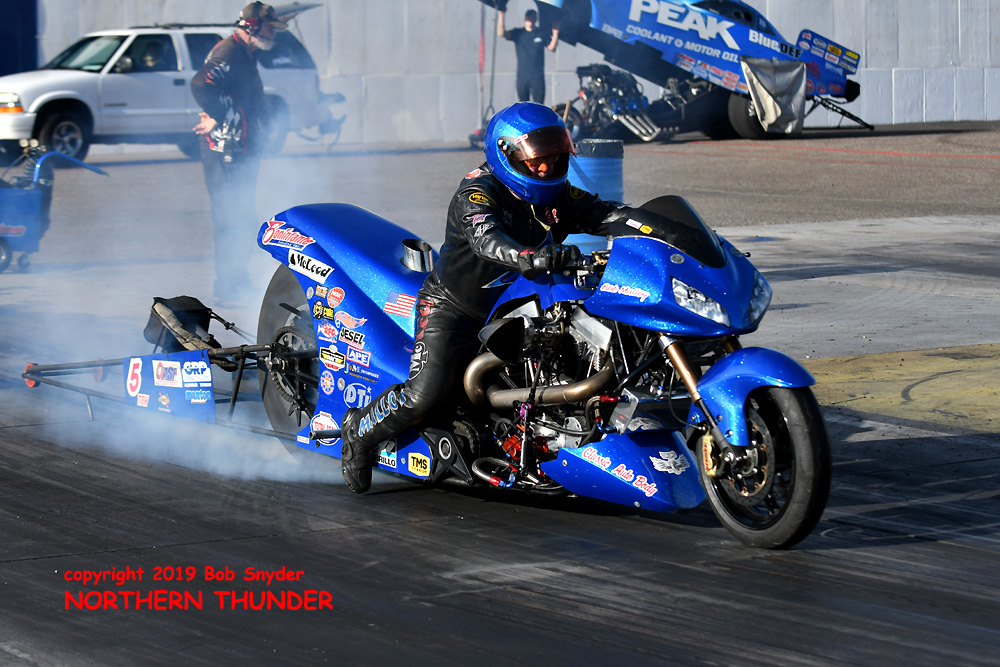 (LEFT) Despite what we reported earlier, there are a couple of non-Camaro entries still in competition, and Utah's Jeff Isbell is fielding one of them: a brand-new Jerry Haas-built 2019 Mustang for his return to the class after competing five times in late 2014 - early 2015. (RIGHT) One of three Alberta (Canada) racers in the Top Fuel Harley class, Edmonton's Kevin Boyer had a tough season in 2018, finishing well down in the standings in the #9 slot. He's hoping for better luck and better results this year