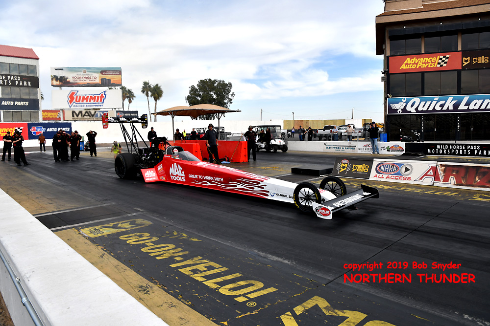 Here's Thursday's photos from our intrepid photog, Bob Snyder, basking in the (luke)warm Arizona sun while the rest of the continent is freezing. While the weather wasn't too hot at Wild Horse Pass, the on-track action certainly was, with Steve Torrence first to dip into the 3.60's with a testing best of 3.689 - 328.78 to easily top the charts.