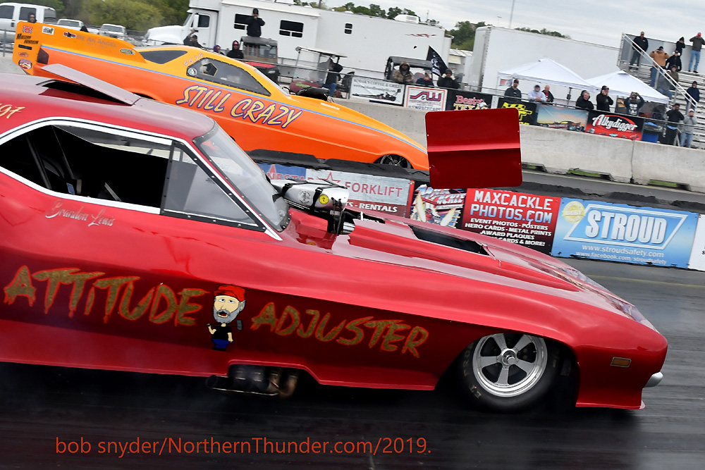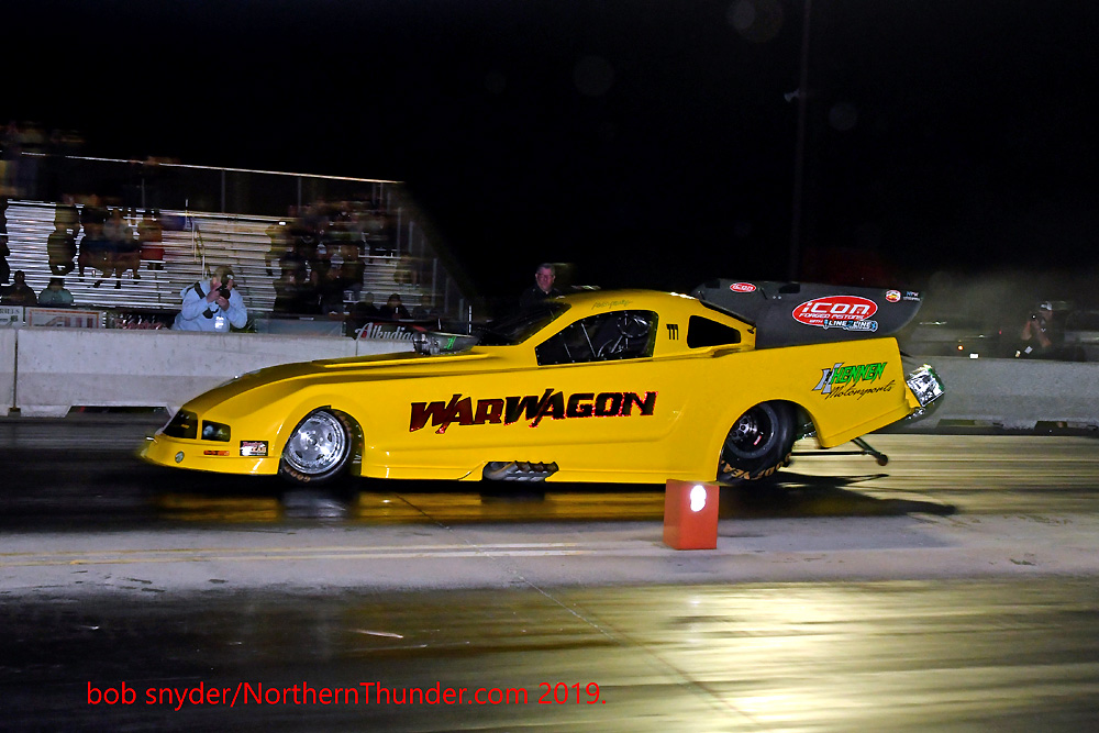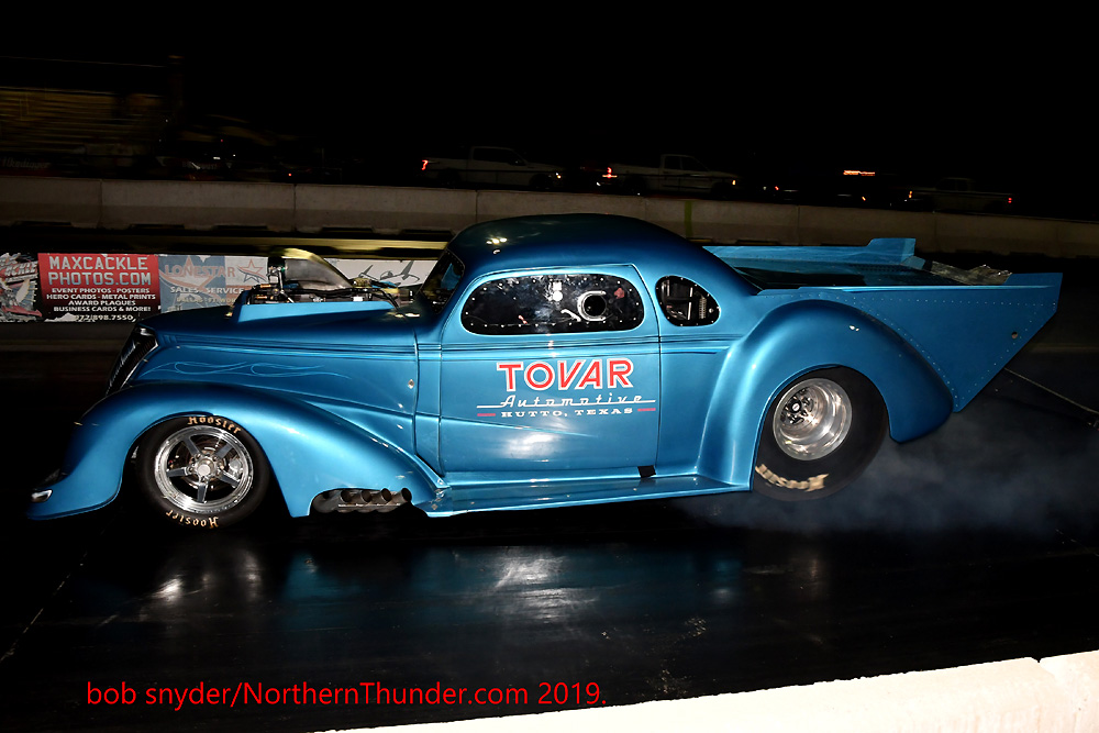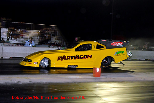 (RIGHT) Quickly laying waste to a "legend" (at least the car is) was Nick Poloson in the "Bucket List" (near lane) as he put down a career-best 3.79 to easily cover the "Blue Max" tribute car of Ronny Young which trailed with a solid, but losing, 4.12 time