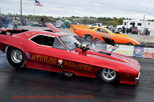 (LEFT) Suffering the ignominy of the dreaded pushback by the crew, the broken "Motivation" Mustang of newcomer to the series, Chuck Loftin was unable to offer any competition to his first round opponent Kebin Kinsley. The "Motivation" moniker and paint scheme is a tribute to a true Texas Funny Car legend, Billy Meyer