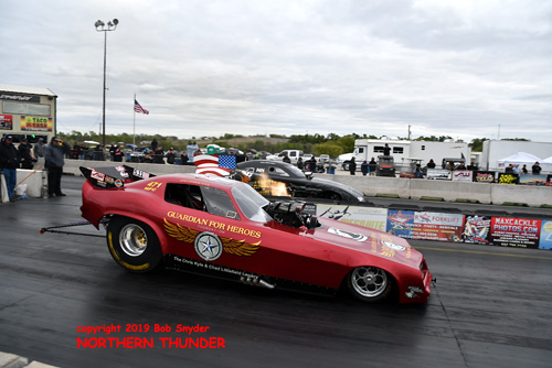 (LEFT) Taking a slight lead at the green, Nancy Matter (near lane) in the "Guardian for Heroes", was quickly dispatched by the very powerful "American Outlaw" (far lane) of Allen Middendorf by a 5.17 to 6.58 verdict to close out the first round of the A field