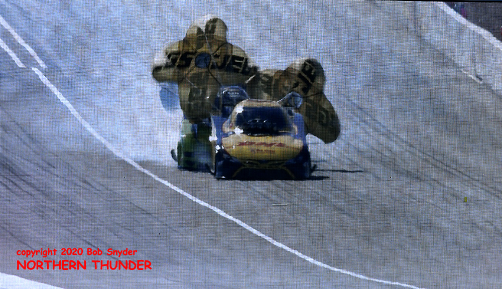 Two views of the Top Alcohol Funny Car runner-up, Bob McCosh Jr., burning out on the left, and launching hard with the front wheels just off the concrete on the right. Although he had the better numbers 5.499 - 266.64, to winner Greg Bellemeur's almost-as-good 5.500 - 266.06, the reaction times told the tale. Bellemeur's .028 light covered McCosh's good, but not quite good enough, .058 time, and the margin at the 1320 mark was a little more than half a car length.