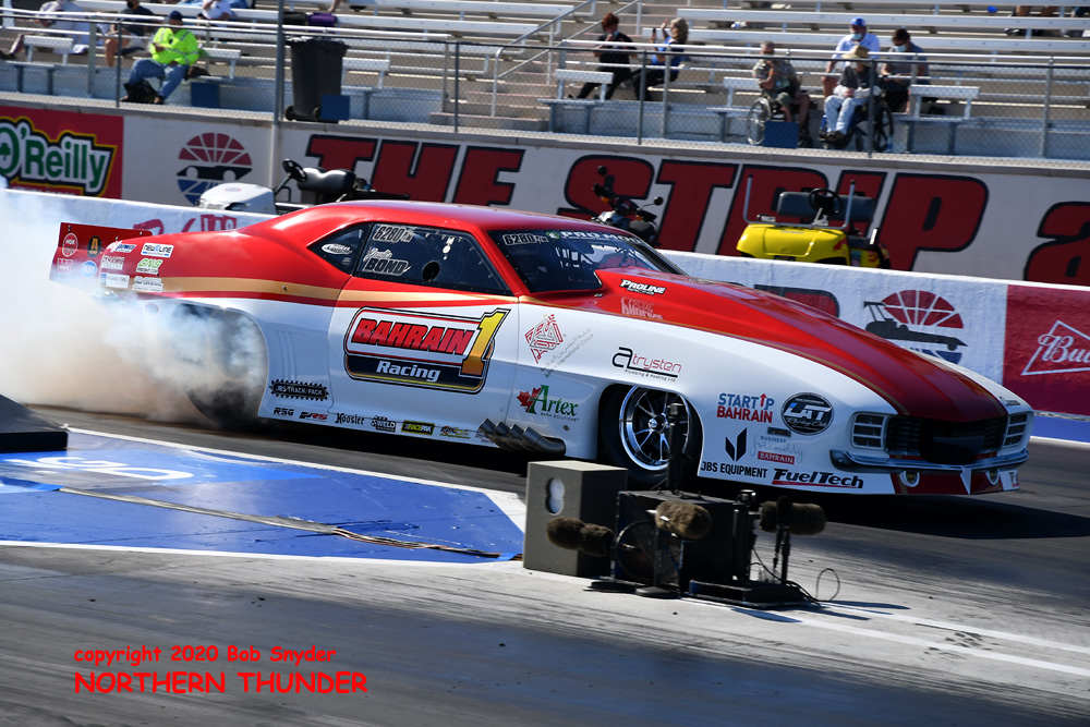 With a short (11-car) field, the Bahrain 1 team filled the semi-final round, with all three of their cars advancing to that round of competition. Then it was down to the final two, with (on the left) Khalid alBalooshi burning out in his ProCharger-equipped 2019 Camaro, while (on the right) the screw-blown 2018 Camaro of Stevie "Fast" Jackson lights up the big Goodyears.