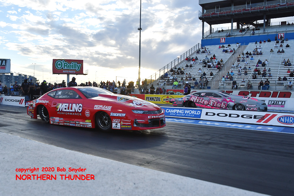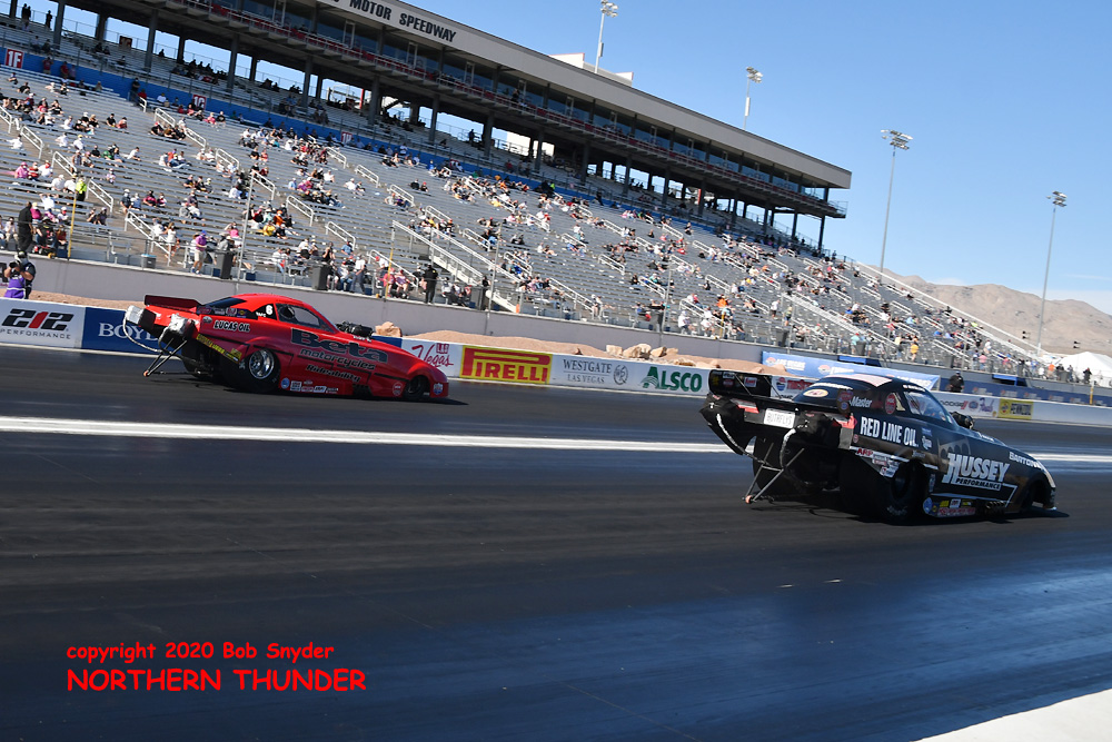 (RIGHT) The story for this pair is the opposite of the Funny Cars, as they finished the first session in the top two spots, and stayed there on the final qualifying sheets. To show the consistency of these teams, they were the quickest cars in both qualifying sessions. In the far lane, Megan Meyer followed up her 5.203 - 271.79 with an almost as good 5.236 - 269.56 pass, while on the near side, Shawn Cowie fell off slightly from his earlier 5.208 - 276.80 to a merely very good 5.258 - 276.13 in the final session. Interestingly, Cowie had the two fastest passes of qualifying at over 276-mph, beating out the BIG horsepower of the A/Fuel cars.