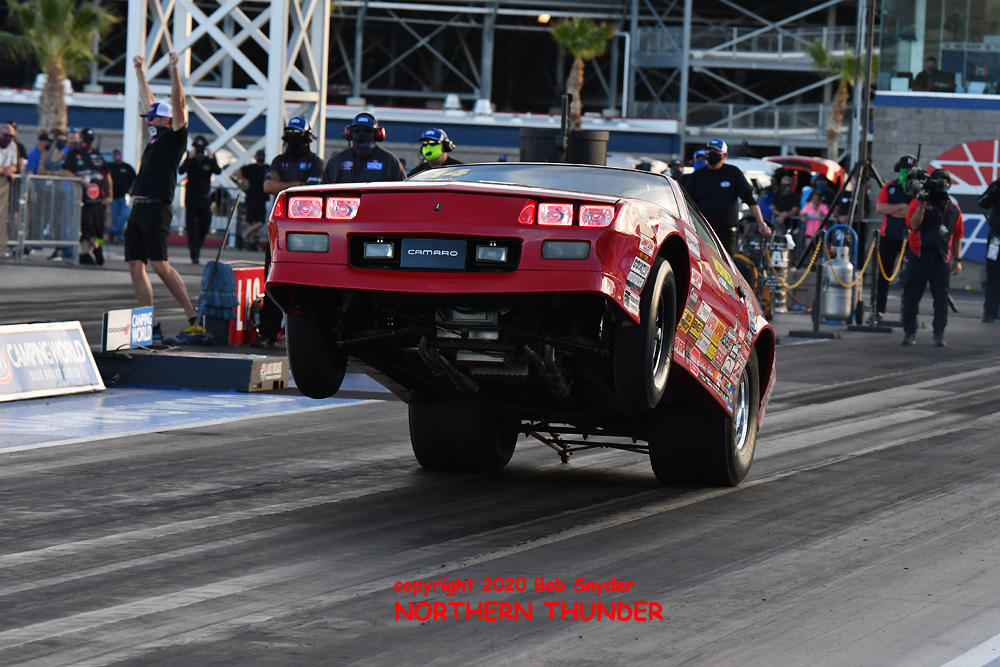With a restricted 9" wide rear tire, the Factory Stock cars have to work very hard to keep them biting, so launching with the front end high is necessary to get enough weight on the rear wheels to keep them hooked up. Both finalists did it well, with (left side)