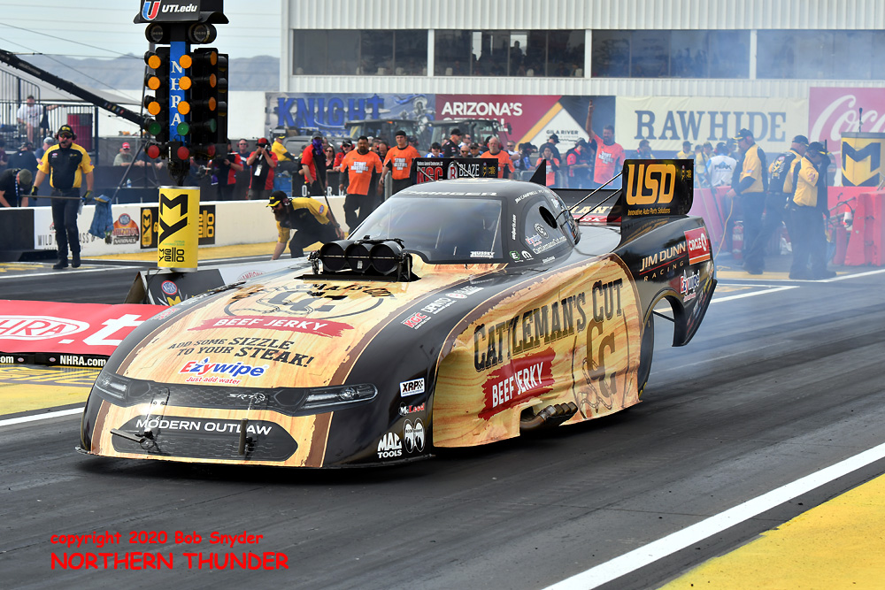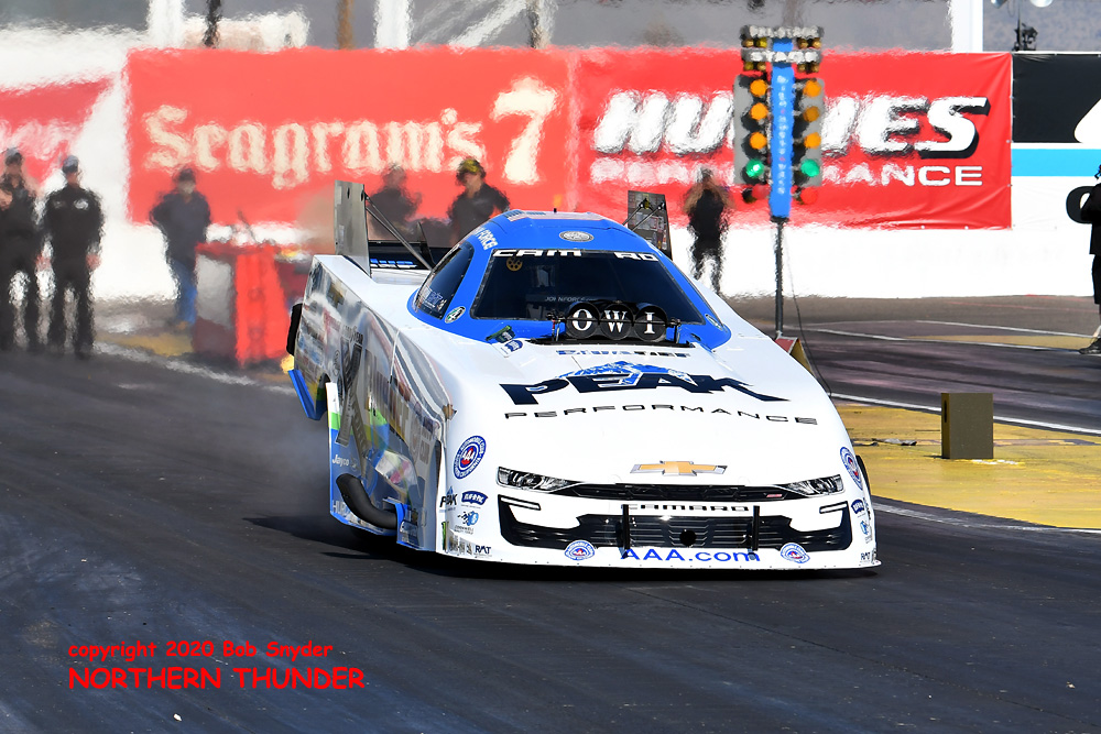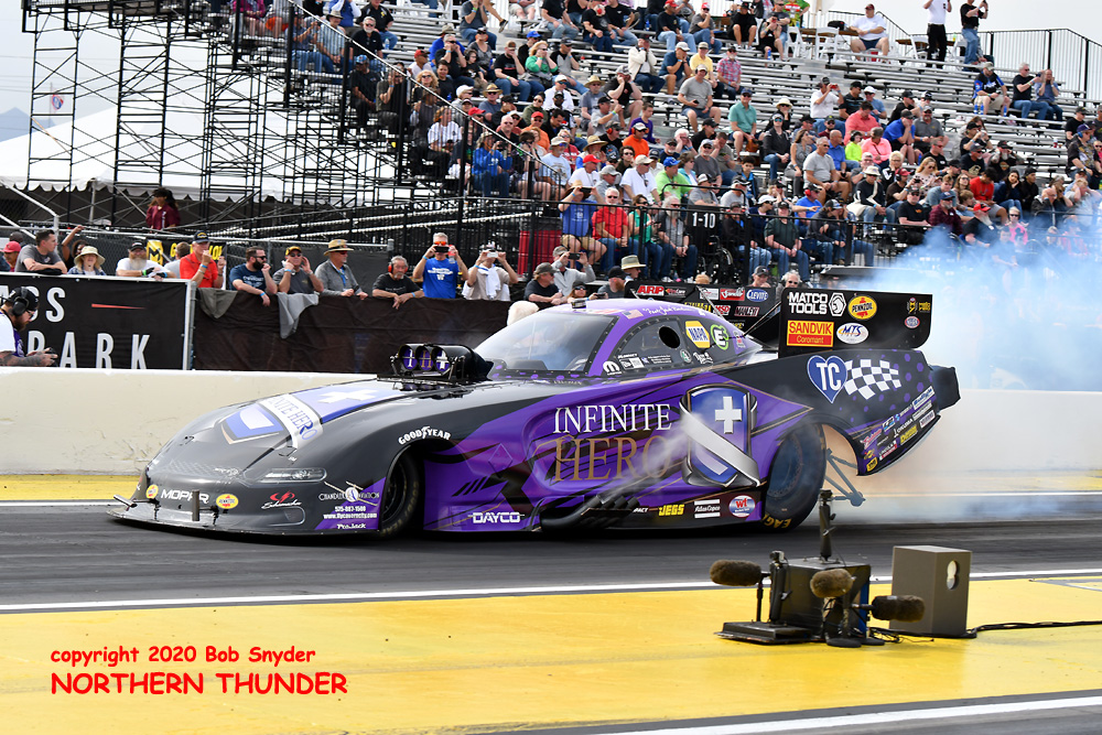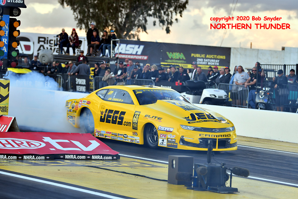 (RIGHT) Closing out qualifying was the most dominating car in the class (so far) in 2020, as Jeg Coughlin Jr. slowed slightly from his top qualifying 6.536, with a best of the session 6.553 time. That run kept his streak alive, as he has run low e.t. of every qualifying session this session (seven) and every elimination round (four) to this point. An amazing performance from the JEG's team.