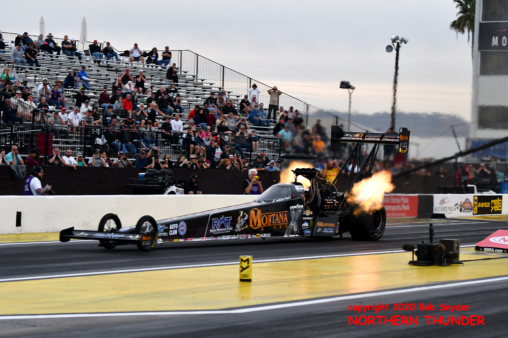 (LEFT) Coming off a real high with a runner-up finish at the Winternationals, second year pro Austin Prock fell hard with a tiresmoking first round loss at the Arizona Nationals. Consequently, they were out testing the Montana Brands Top Fueler before heading east to Gainesville.