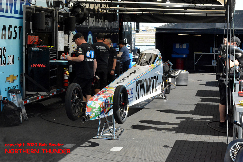 (RIGHT) Justin Ashley's pit area as they prep the "Strutmaster" Top Fuel car