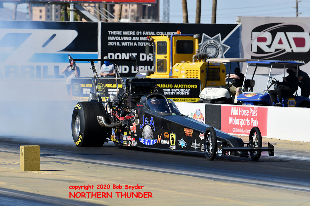 (RIGHT) Pairing up with Jones in the first session, Don Hudson burns out for the first time in quite a few years. It's been even longer since he last ran in Top Alcohol, as his nitro nostalgia flopper has been competition choice in recent years.