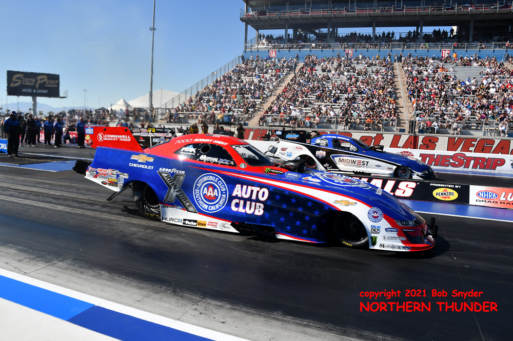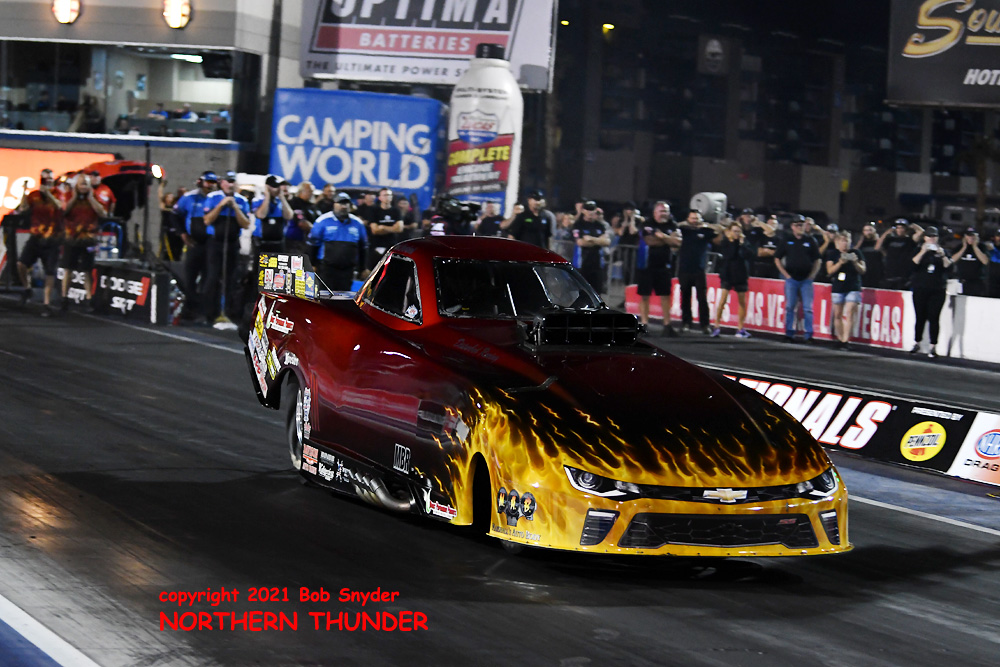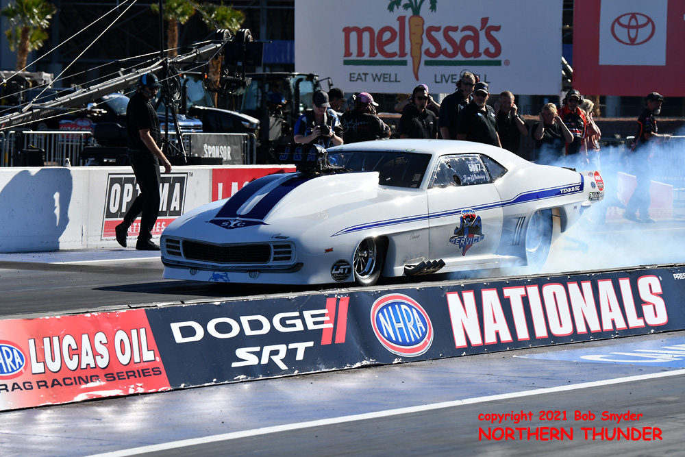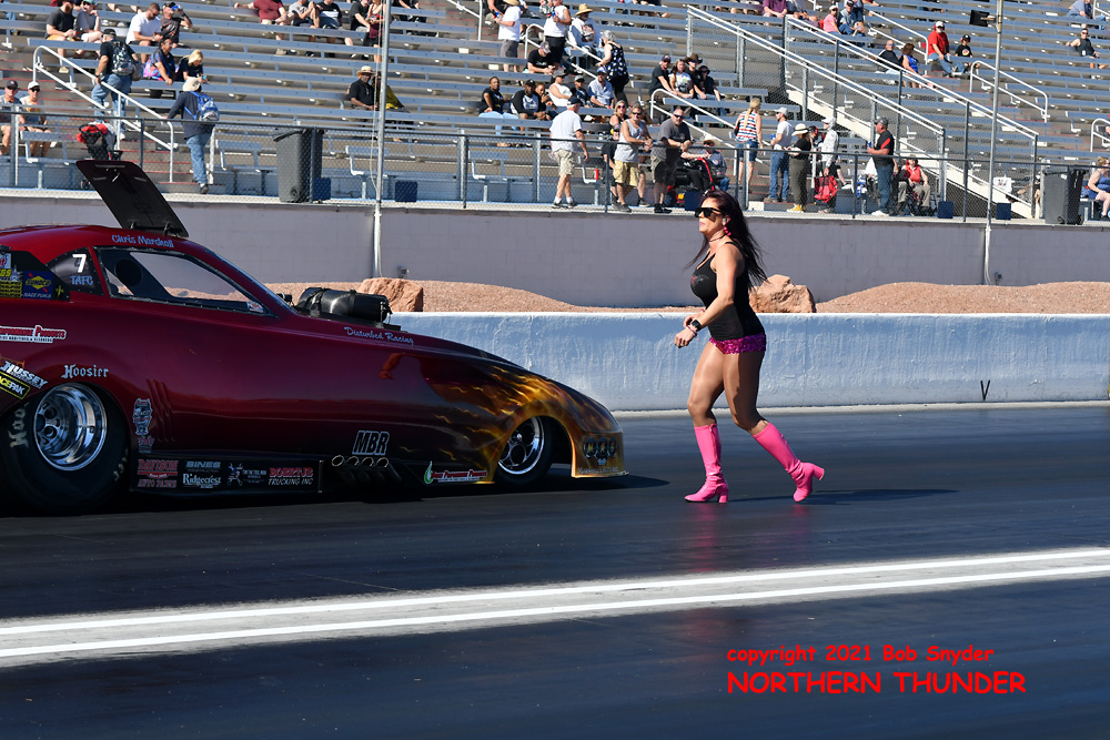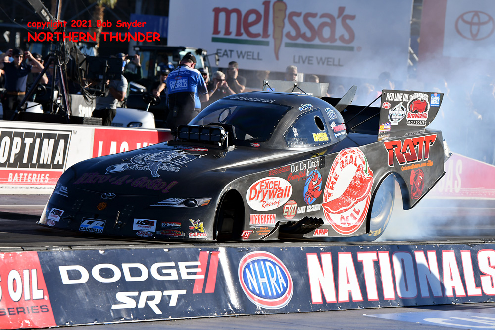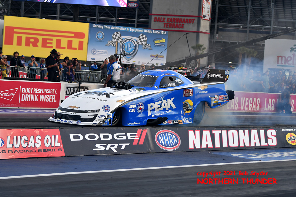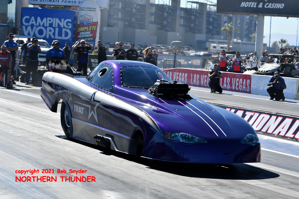 (LEFT) Seldom seen on the NHRA scene this year is Oregon's Chris Marshall, but he made his presence known at The Strip in a real hurry - like in 5.504 seconds at 265.01 mph. This was only his fourth NHRA race of 2021, following two regional races - both wins - and a semifinal finish at the U.S. Nationals. Like he has for the past few seasons, he's a real threat to the full-time competitors.