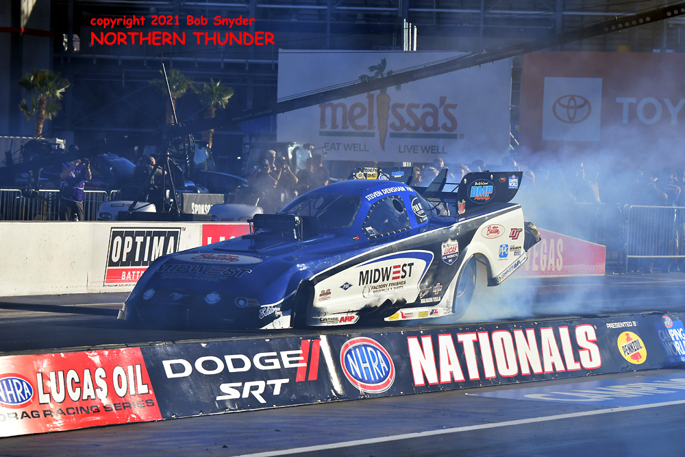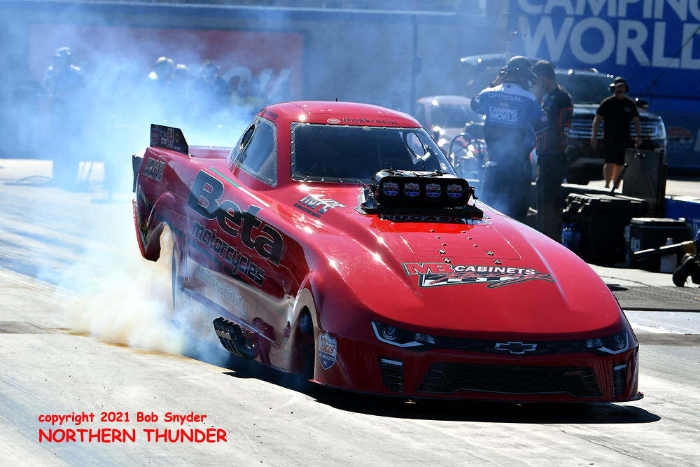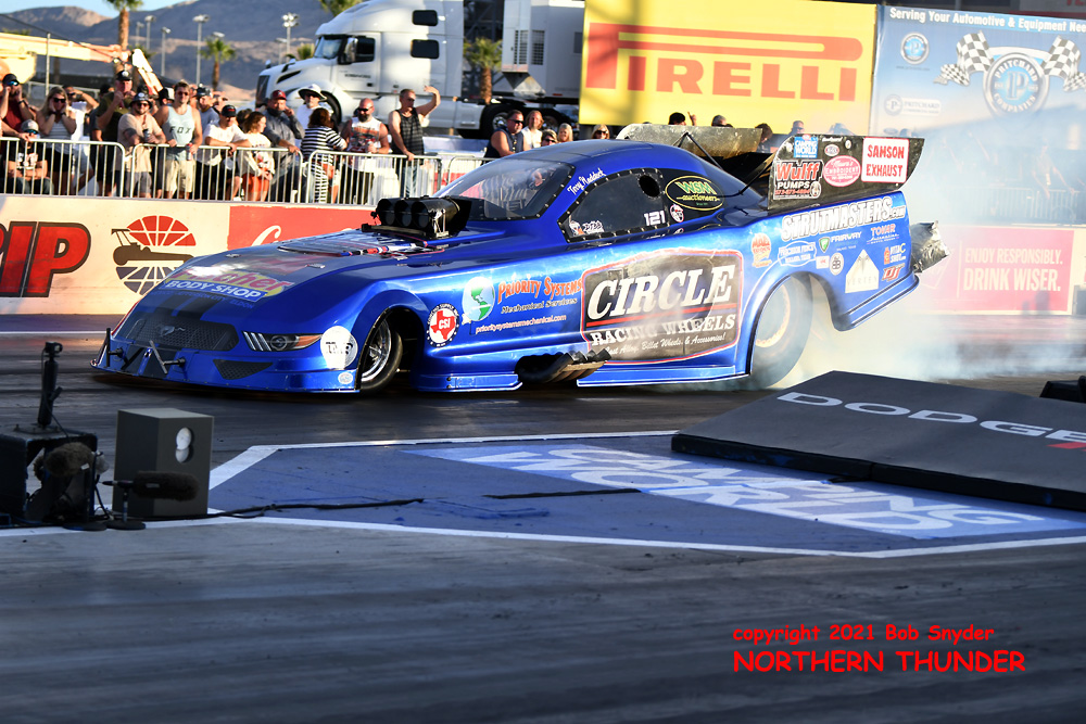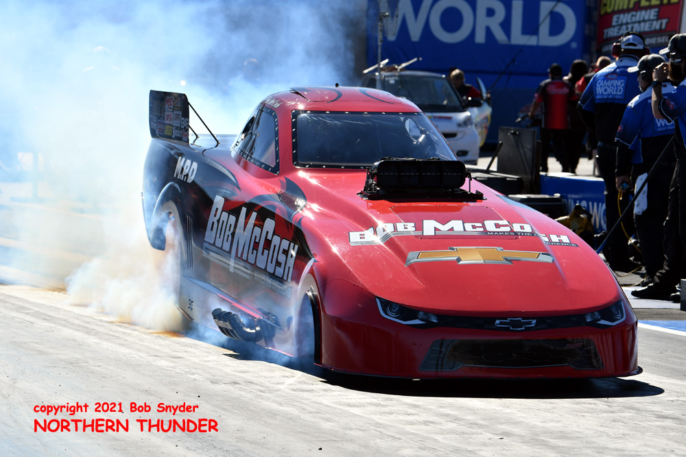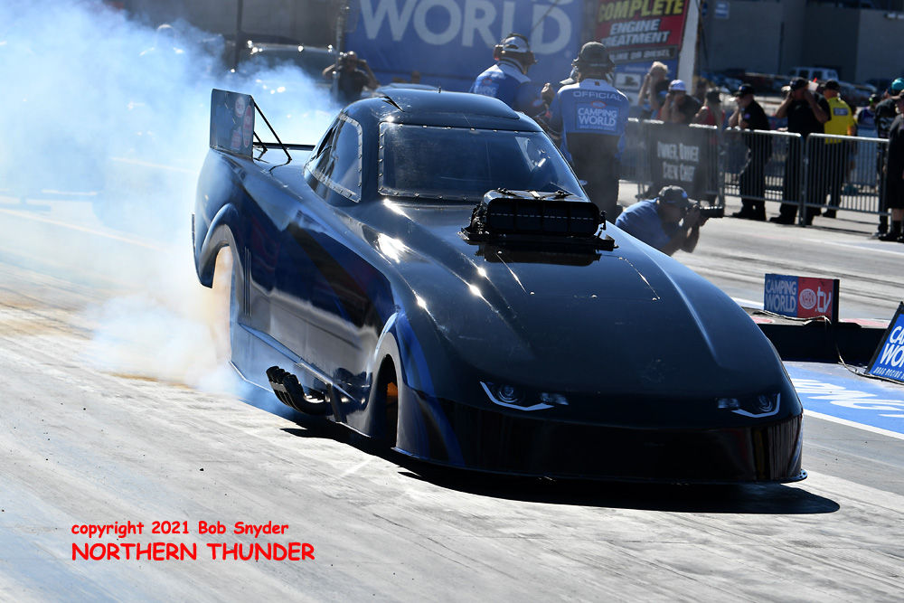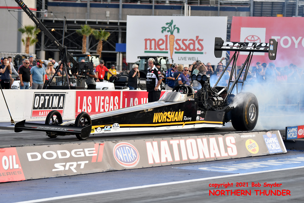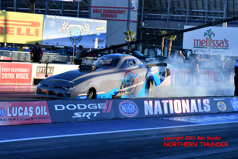 (LEFT) Seldom seen on the NHRA scene this year is Oregon's Chris Marshall, but he made his presence known at The Strip in a real hurry - like in 5.504 seconds at 265.01 mph. This was only his fourth NHRA race of 2021, following two regional races - both wins - and a semifinal finish at the U.S. Nationals. Like he has for the past few seasons, he's a real threat to the full-time competitors.