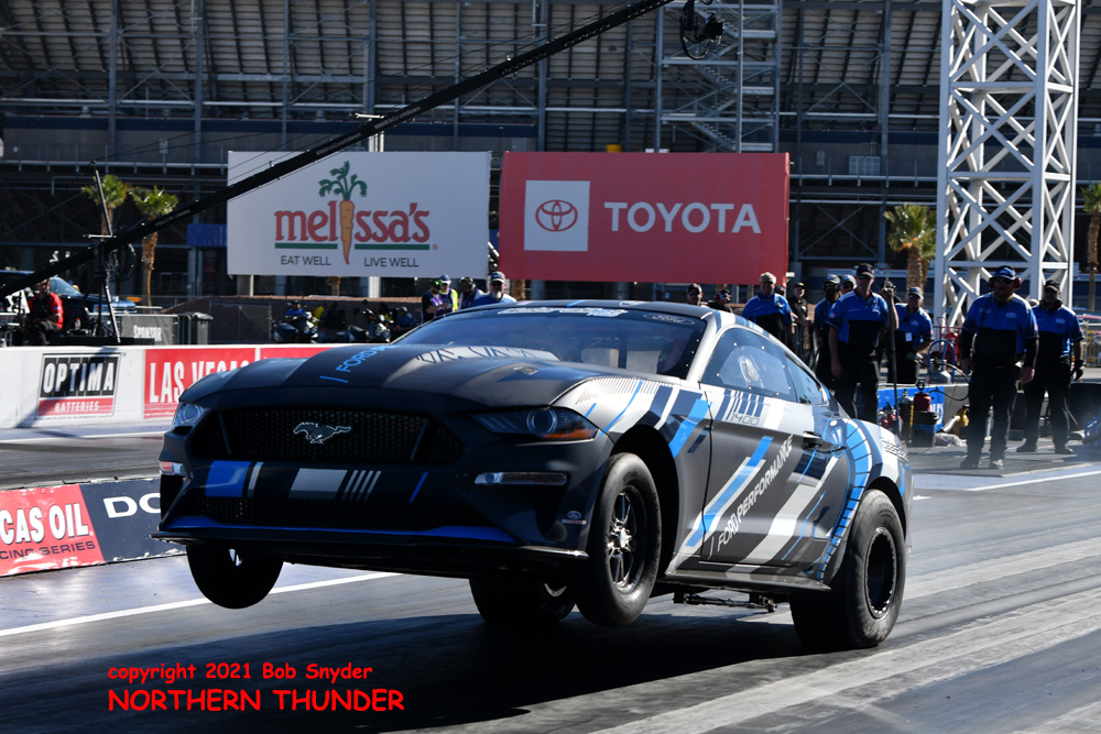 Before the Pro cars took to the track, two of the exhibition vehicles in attendance made passes. On the left, it's the 1400-hp electric-powered Cobra Jet Mustang, that runs in the 8-second zone, and on the right, it's the 7-second 200+ mph electric dragster of Washington state's Mike Huff. It produces 1950-hp and will eventually come close to the six-second zone, with a current best of 7.52 for the quarter-mile.