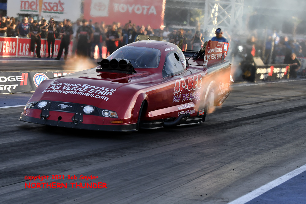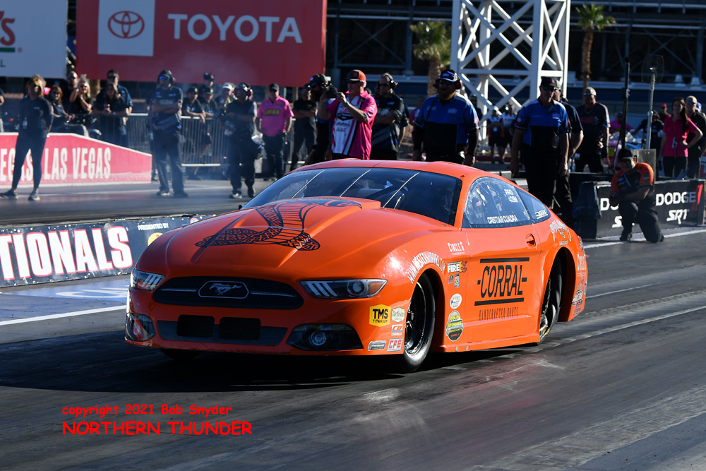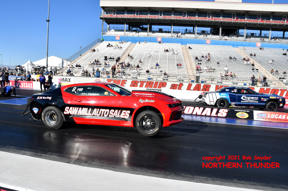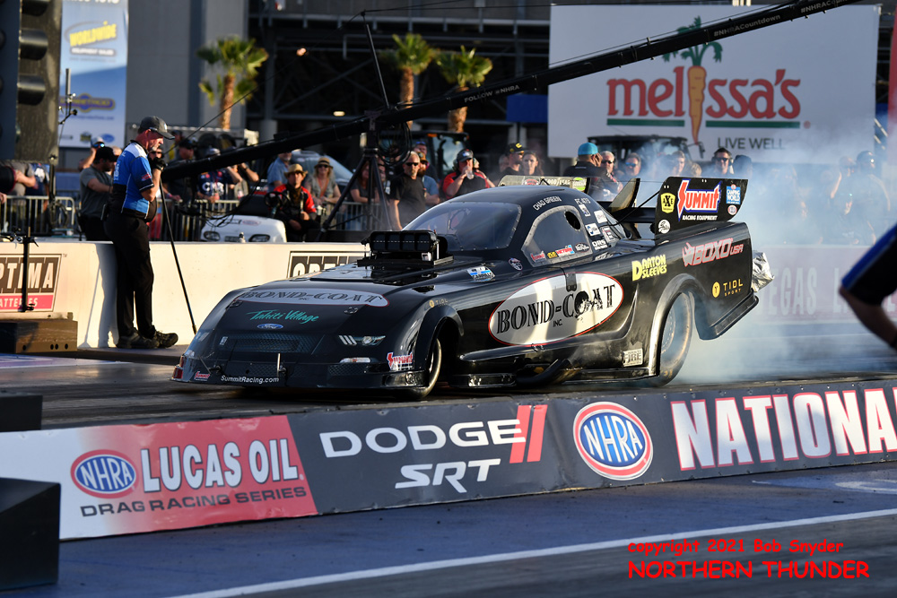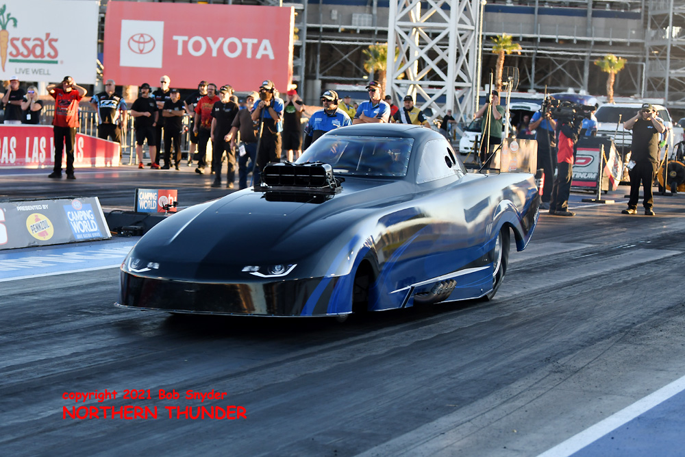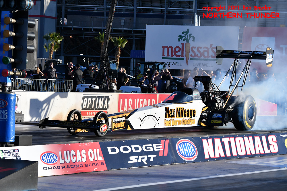 (RIGHT) Coming all the way west from Missouri, Bob McCosh was looking to recapture the #3 spot in the national standings with Las Vegas being his final choice to do so. He made a good start to his race with a solid 5.584 - 263.46 (new top speed) to bump Whiteley out of the #3 spot in the field and show that he was ready to run hard at The Strip.