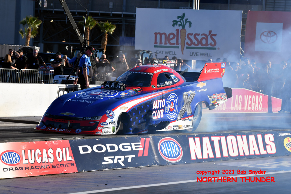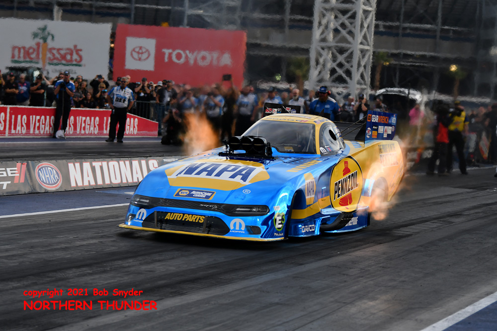 A much tighter race for the championship was developing in Funny Car, as coming into the event, Ron Capps was just ONE point in front of defending champion Matt Hagan. Sitting in third place was J.R. Todd, but with an 83-point deficit, his task to climb back into contention was indeed a daunting one. Sitting on the virtual bubble was #4 in the points, John Force and he needed nothing less than an event win to move back within striking distance of the leaders. The tension was running high as the first pair came out from under the BIG "The Strip" sign beside the control tower.