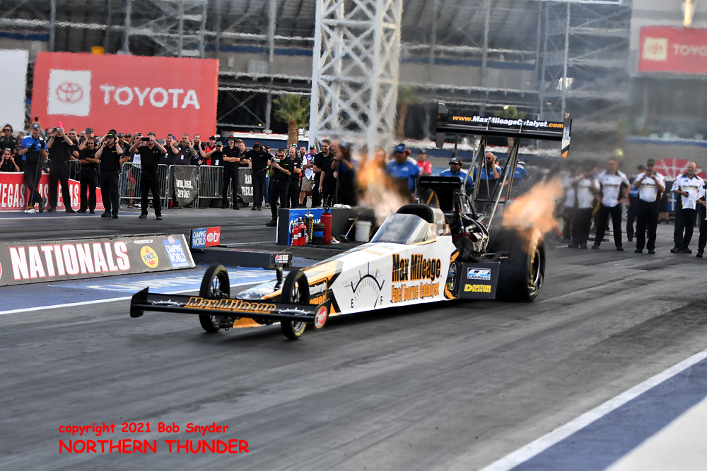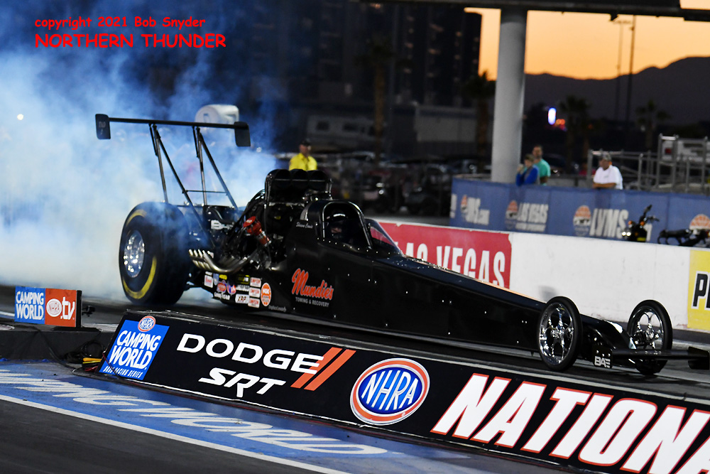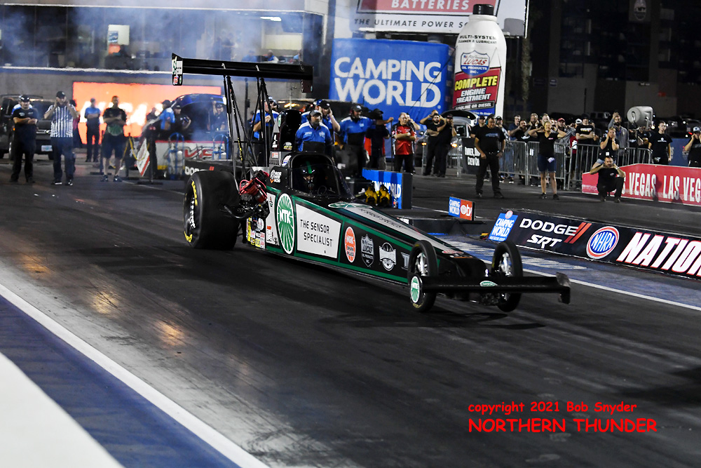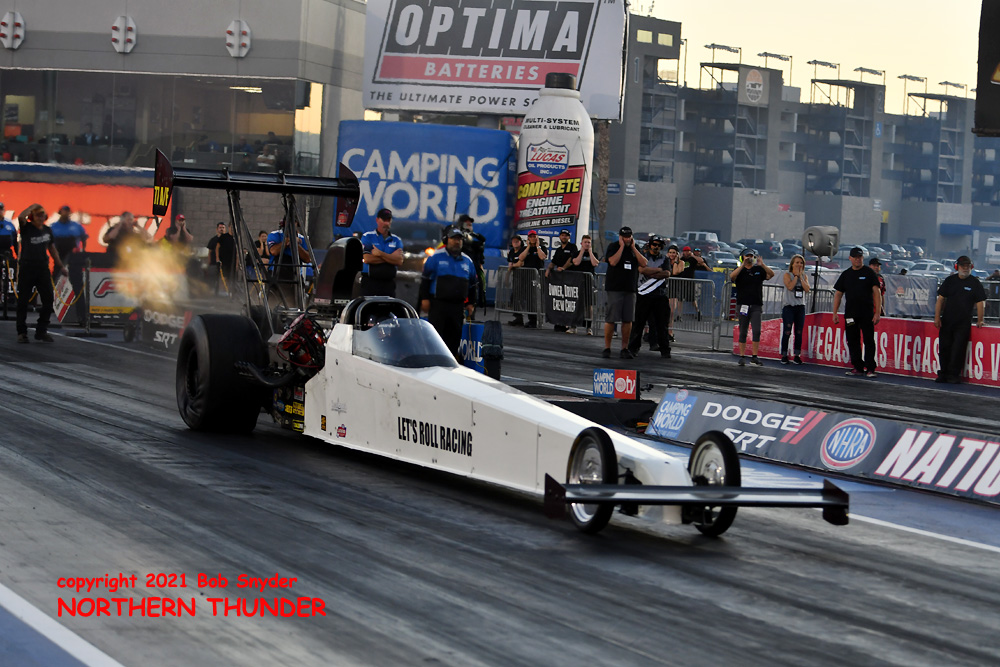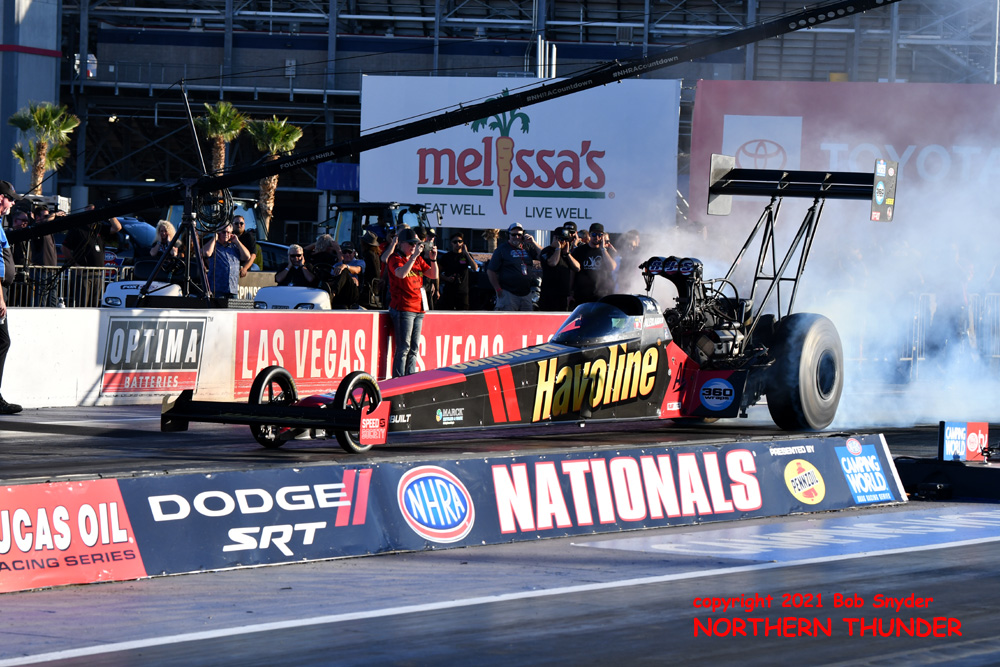 (LEFT) After starting the season in Pro Stock, moving to Pro Mod, back to Pro Stock, then into Top Fuel, 2021 has been a real roller coaster of a year for Alex Laughlin. With the help of major sponsor "Havoline", he's made a quick progression from never sitting in a T/F'er until five days before qualifying started at Denver in July, to running regularly in the 3.70's almost right away. He opened his account at The Strip with a solid, if unspectacular, 3.809 - 318.34 to take a temporary #1 with 11 cars still waiting to run.