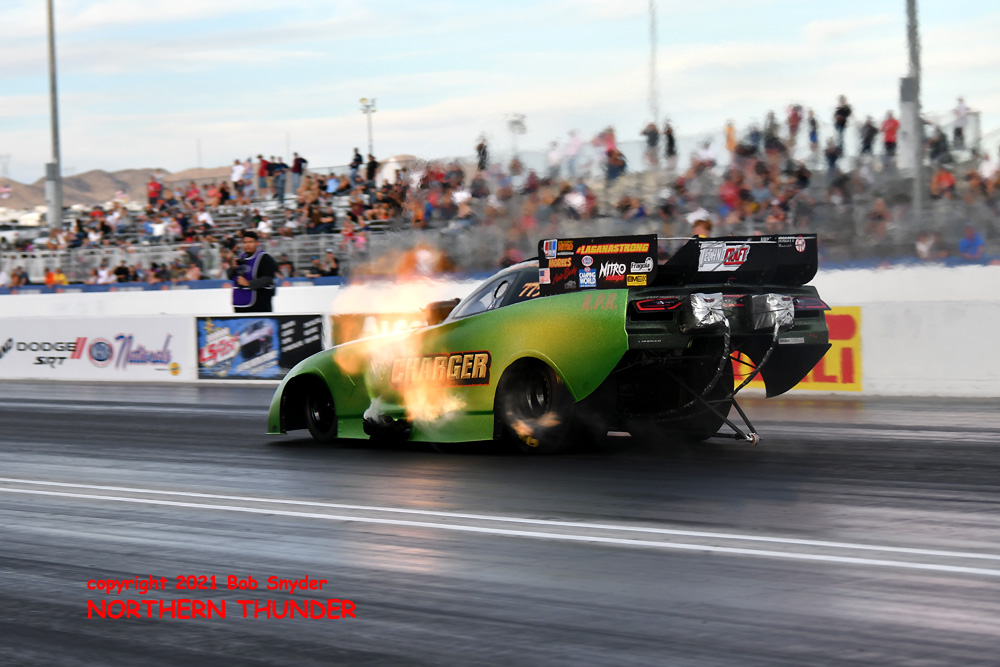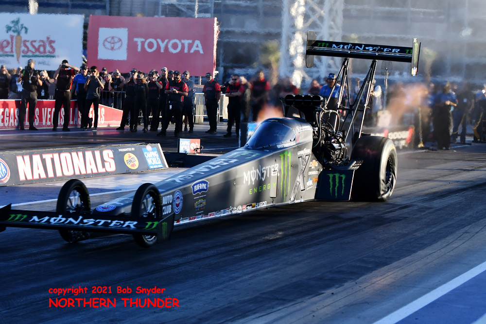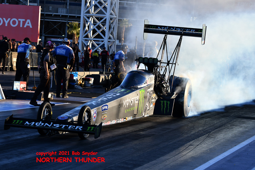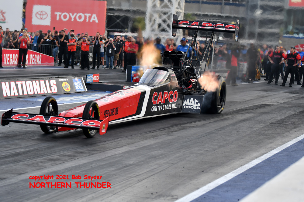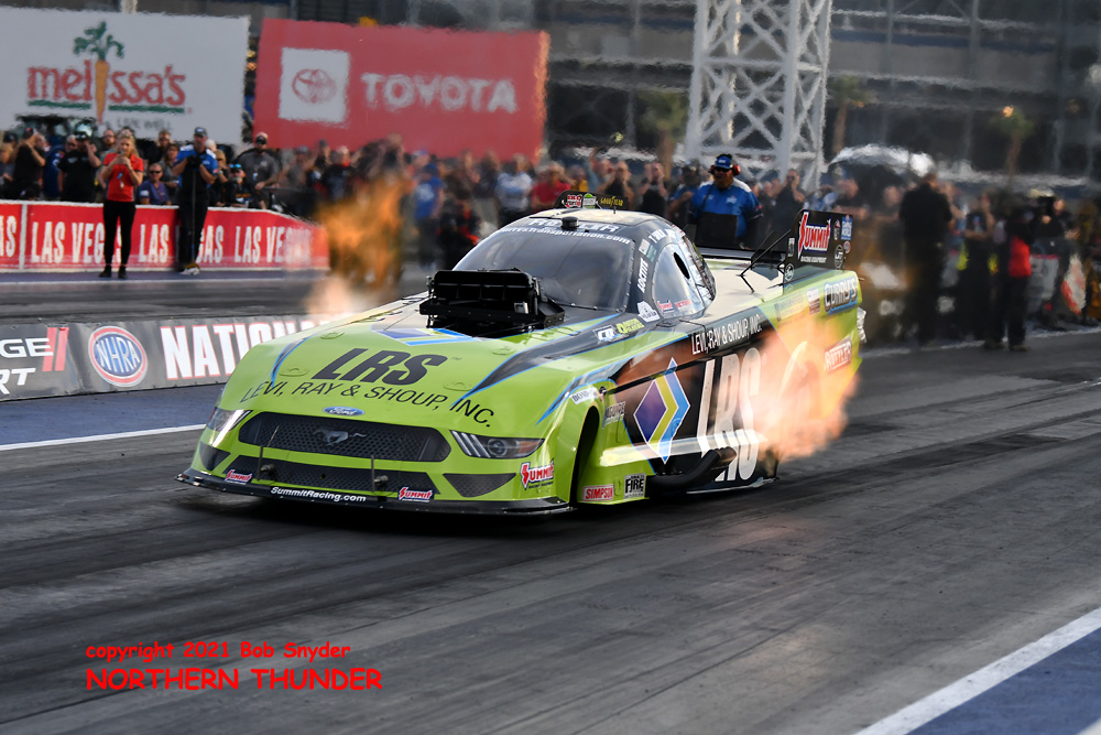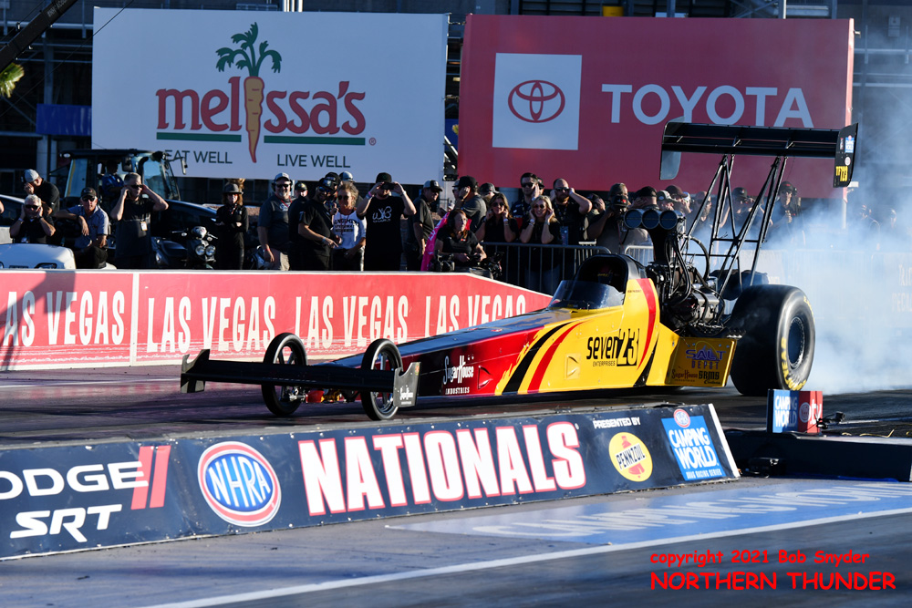 (LEFT) After starting the season in Pro Stock, moving to Pro Mod, back to Pro Stock, then into Top Fuel, 2021 has been a real roller coaster of a year for Alex Laughlin. With the help of major sponsor "Havoline", he's made a quick progression from never sitting in a T/F'er until five days before qualifying started at Denver in July, to running regularly in the 3.70's almost right away. He opened his account at The Strip with a solid, if unspectacular, 3.809 - 318.34 to take a temporary #1 with 11 cars still waiting to run.