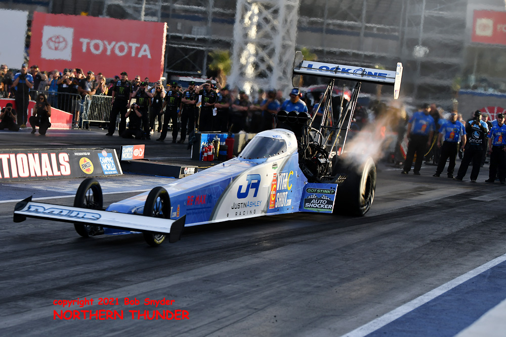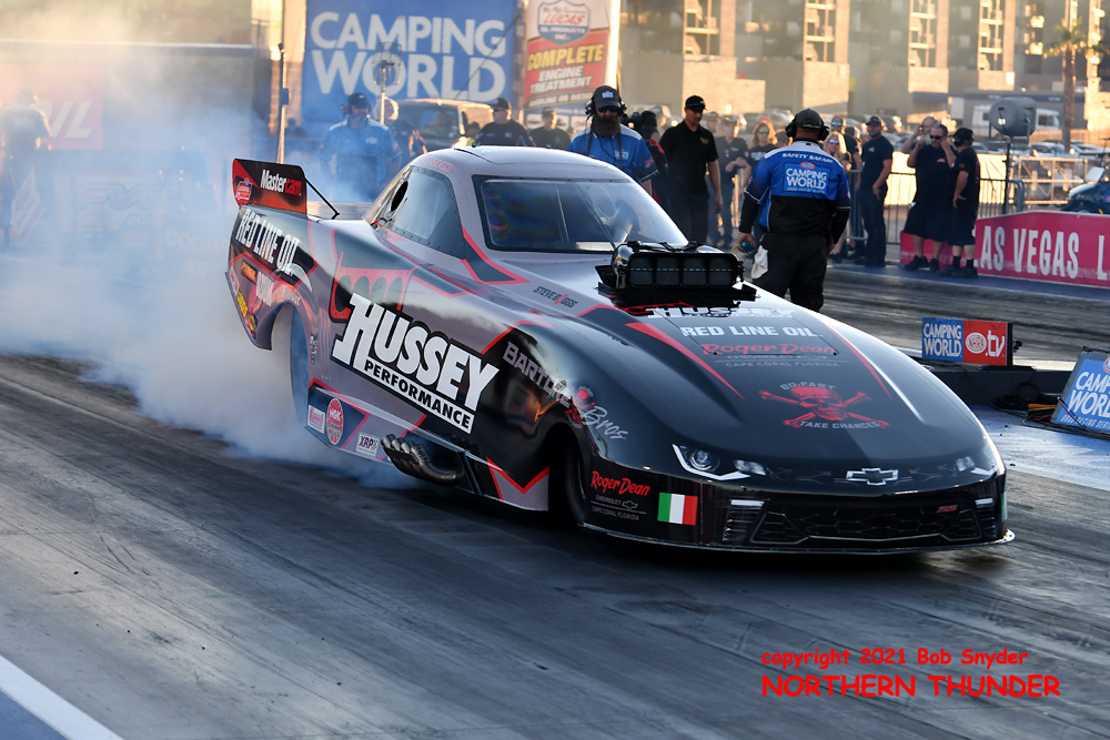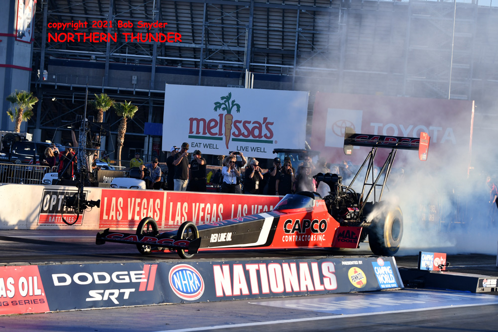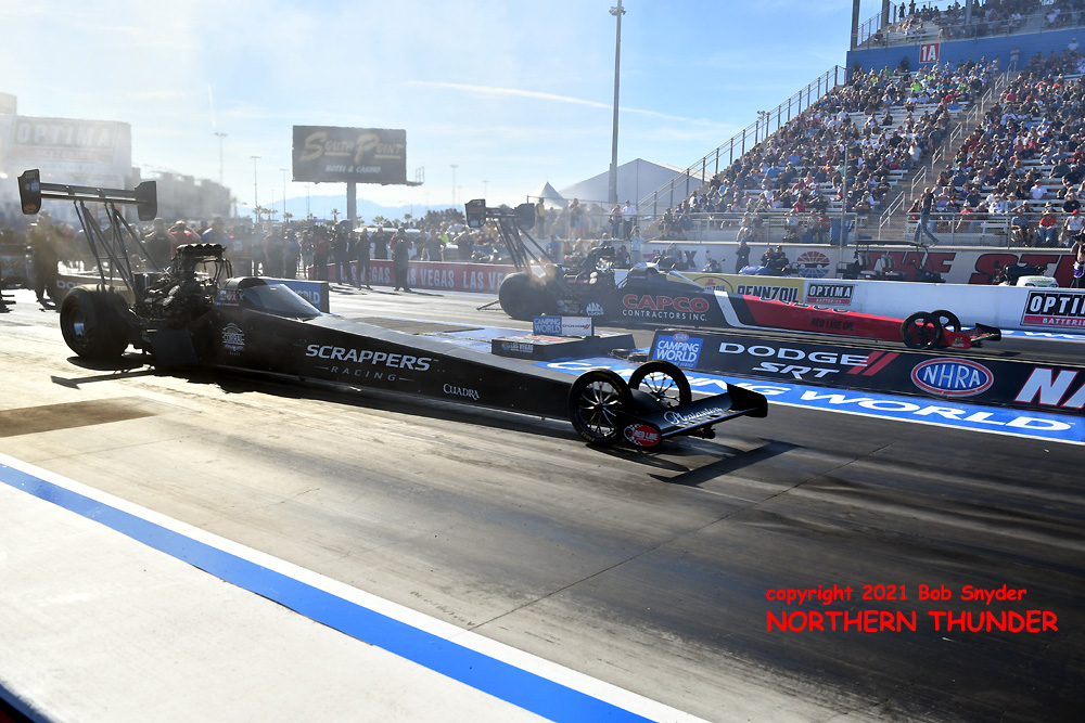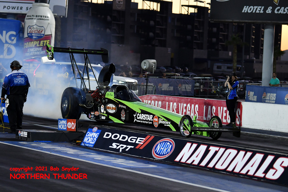 (LEFT) It's been quite a first season in Top Fuel for Florida's Josh Hart and his first visit to The Strip in the "R & L Carriers" car marked his 13th race of a 2021 that saw two trips to the Winners Circle (Gainesville and Charlotte). With his scheduled partner electing to sit in the pits, Hart ran by himself and put down good numbers until half track before losing traction and clicking it to a 3.862 - 276.07 opening salvo.