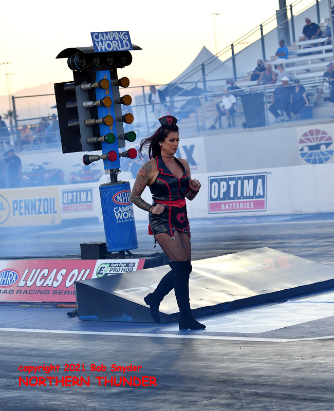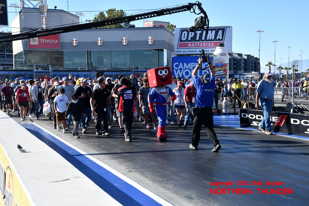 Following the obligatory track walk, which was in hiatus for more than a year due to you-know-what, the fans took the opportunity to walk down half of the four wide Strip at Las Vegas Motor Speedway on the left, while on the right, announcer Joe Costello got to hang out with the two low qualifiers, Brittany Force on the left, and Alexis DeJoria on the right.