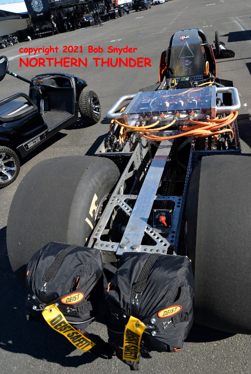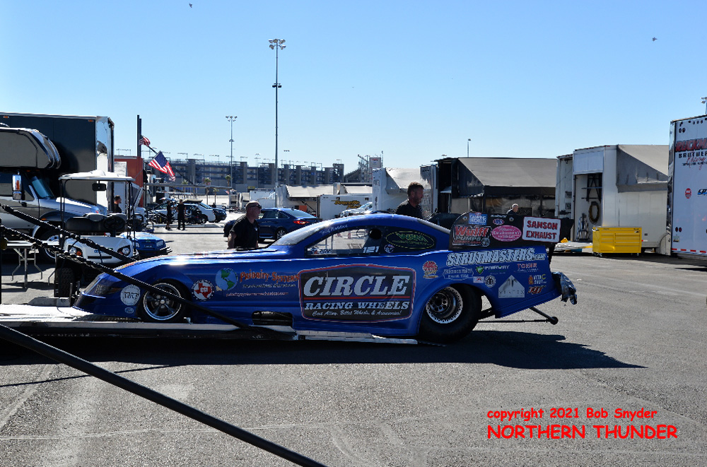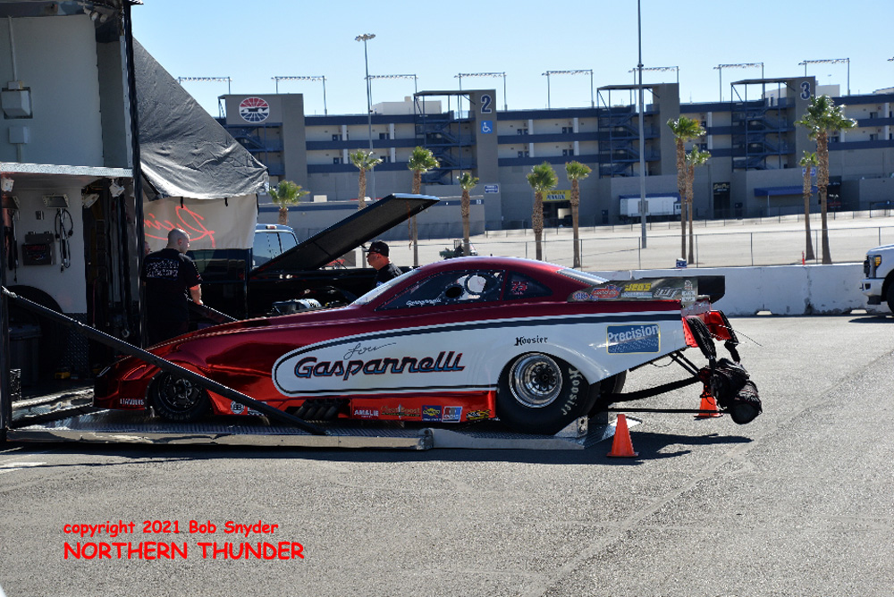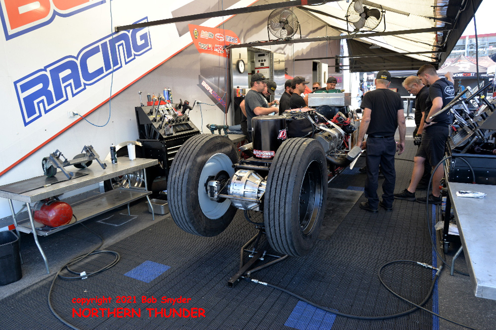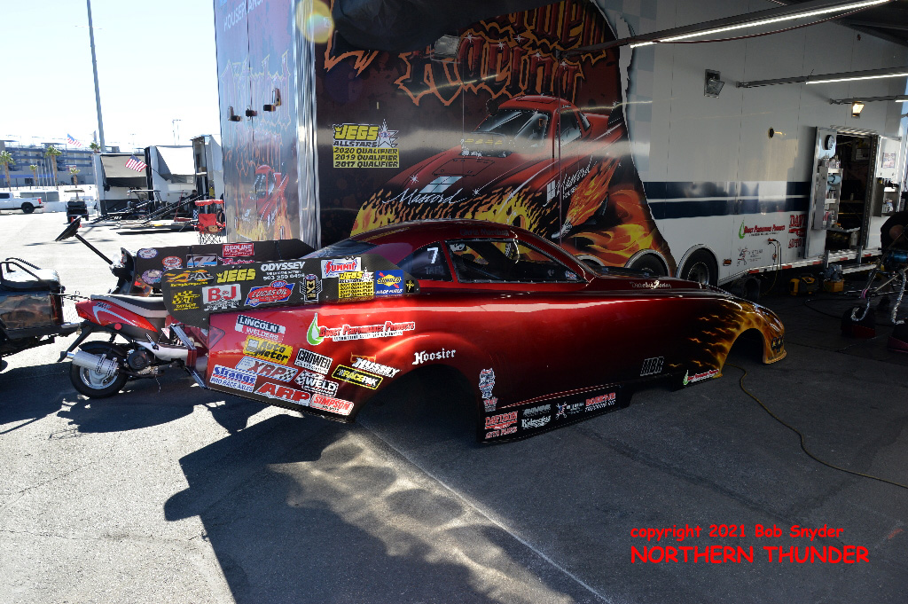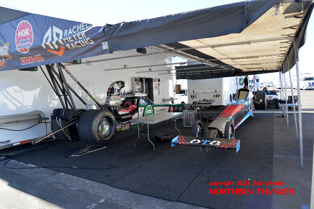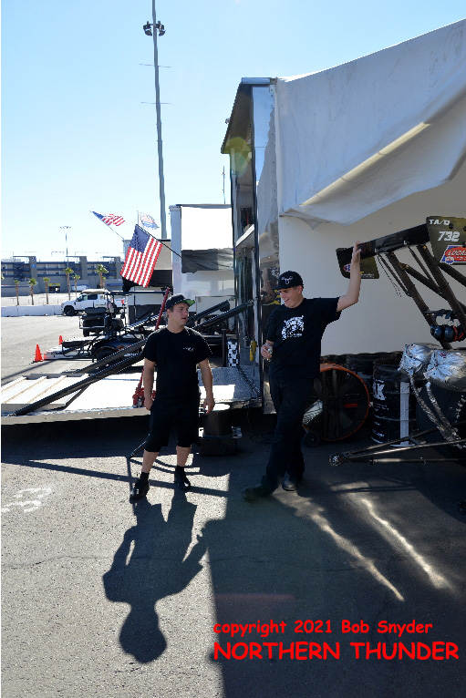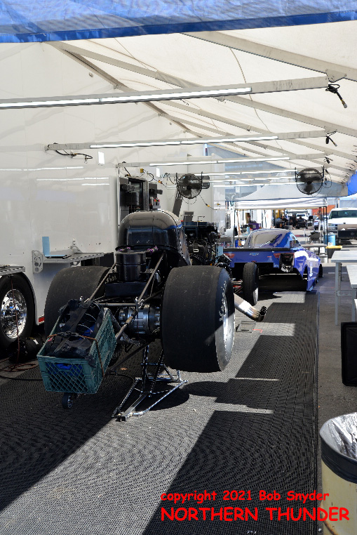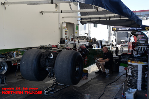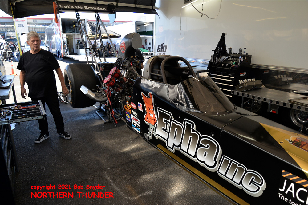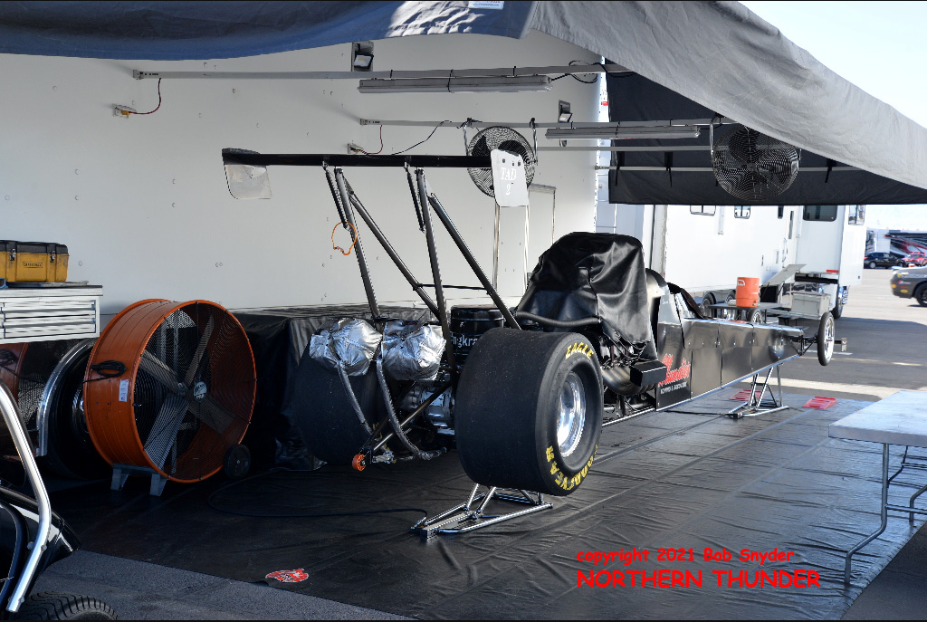 (LEFT) Coming out of Arizona for one of his infrequent appearances at a national event, Mike Burns preps the "Let's Roll" A/Fuel Dragster. This is his second national race of 2021, both at Las Vegas.