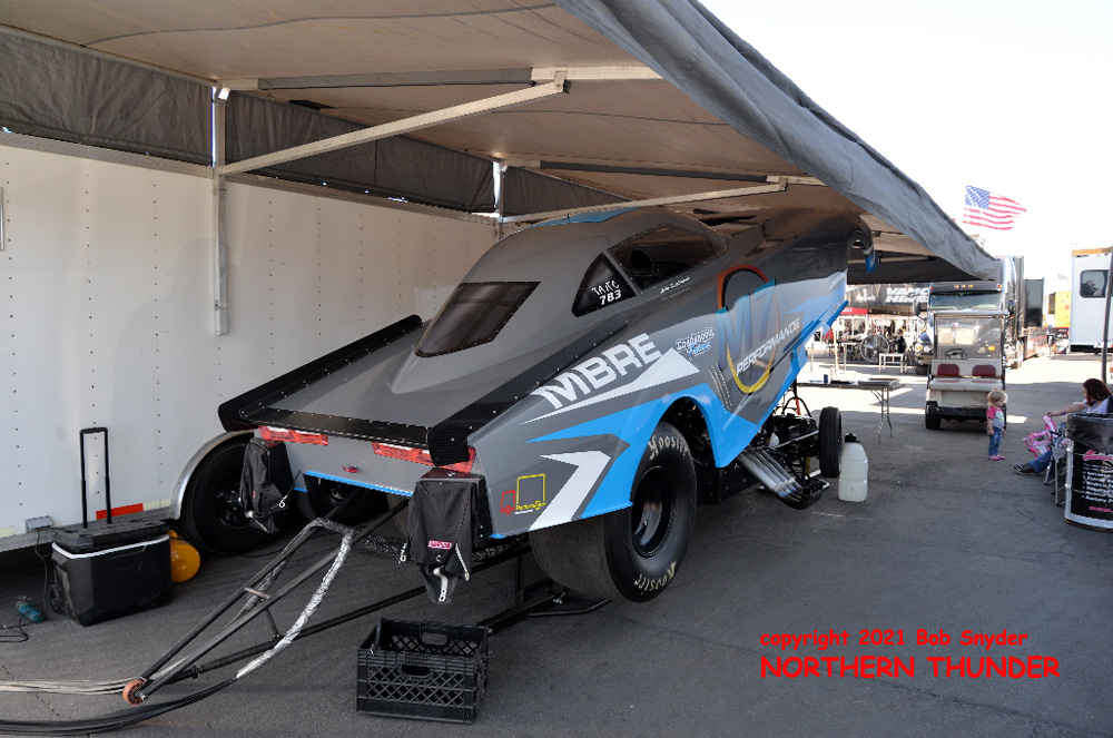 (RIGHT) Another seldom-seen racer, Top Fuel hard-trier Rob Passey brought his "Seven23 Enterprises" car down from Utah for his third race of the year, the most he's attended since a four-pack in 2017. Still looking to get close to the 3-second zone, he's got veteran nitro-whisperer Johnny West directing the crew this weekend.
