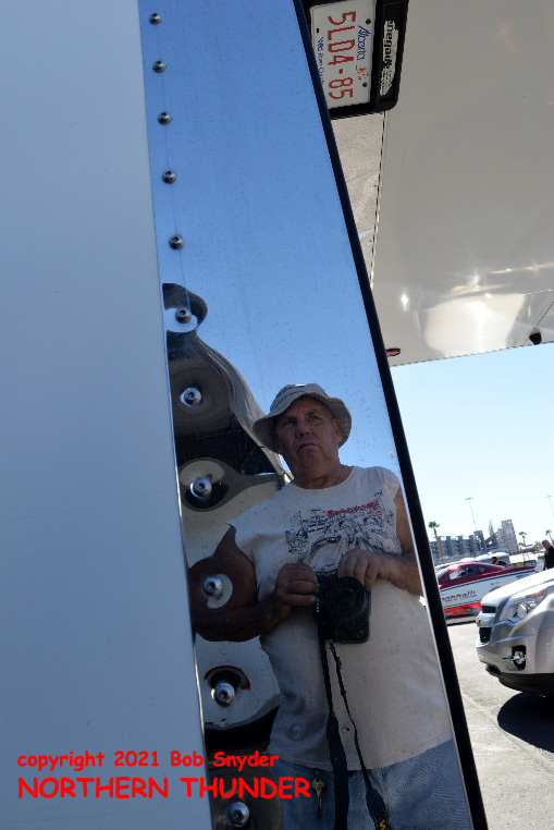 Another three pack with (LEFT) the Chris Demke-driven "Peen-Rite" blown alcohol dragster sitting ready to make it's third national event appearance of the season. The Peen-Rite team has scaled back their schedule in recent years, and 2021 has only seen them at Pomona and Las Vegas. (MIDDLE) Self-portrait time with our ace photographer "BIG" Bob Snyder reflected in the polished chrome trim on a trailer, and (RIGHT) Lounging under the awning, the R+L Carriers Top Fuel dragster of Josh Hart as he makes his first appearance at The Strip.
