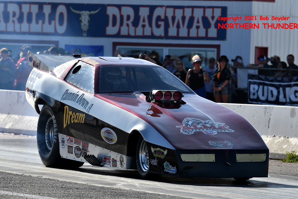 After a very successful - and that's putting it mildly - season opener at the Texas Motorplex, the FUNNY CAR CHAOS crews moved on to Amarillo Dragway for their second event of the 2021 season. With 37 cars on the pre-entry list (down a bunch from the world-record breaking 67 cars on the list at the 'Plex) it was still a very strong turnout, portending strong support for the FCC from the racers. Adding a third ("C") field to this race helped keep up the interest level among the racers and may lead to it becoming a fixture at future events. Here is the full report from the first day, Friday, with photos and results from both qualifying sessions.