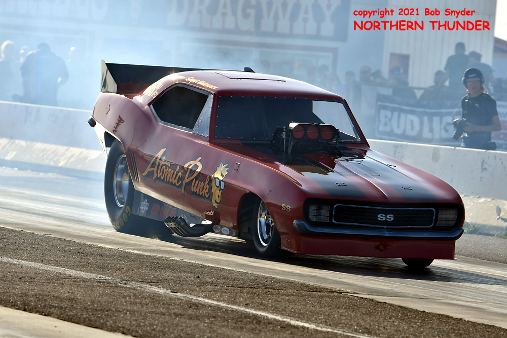 Two long distance travellers came out next, with Don Knoblauch making the long tow down from Sumner, WA to run his "Atomic Punk" Camaro,(left) but not finding results to his liking as his best pass of the day was only 7.011 - 72.42, landing him in the #23 slot. Coming from even farther afield, Edmonton, AB, Canada's Tim Boychuk brought his popular "Happy Hour" entry out for the first time in 18 months, and slipped and slid to a 5.459 - 125.57 for the #18 position