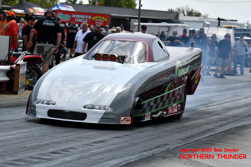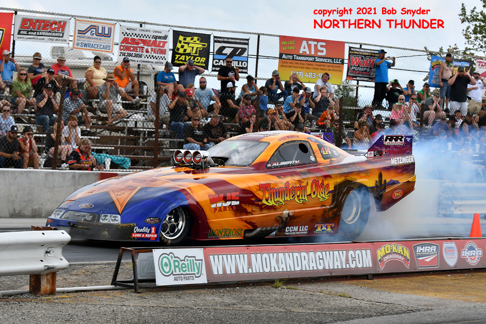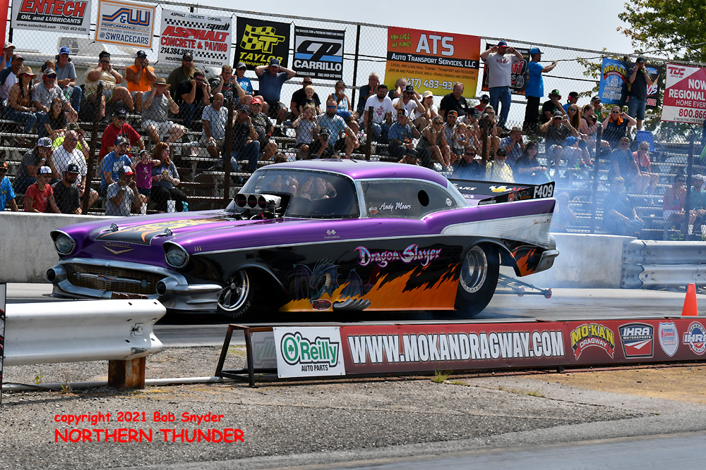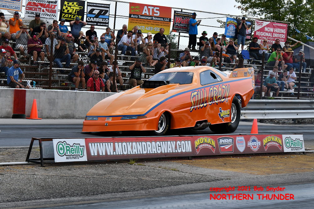 Due to a rain-out on Friday, qualifying at the Mo-Kan Dragway 55th annual "Decade of Wheels" event was downsized to two sessions, at noon and 2:00 pm on Saturday, then eliminations got going at 5:00 pm and continued through until the finals around 10:00 pm. Of the 37 racers pre-entered, 34 made at least one qualifying attempt before the fields (A, B, & C) were set for eliminations.
