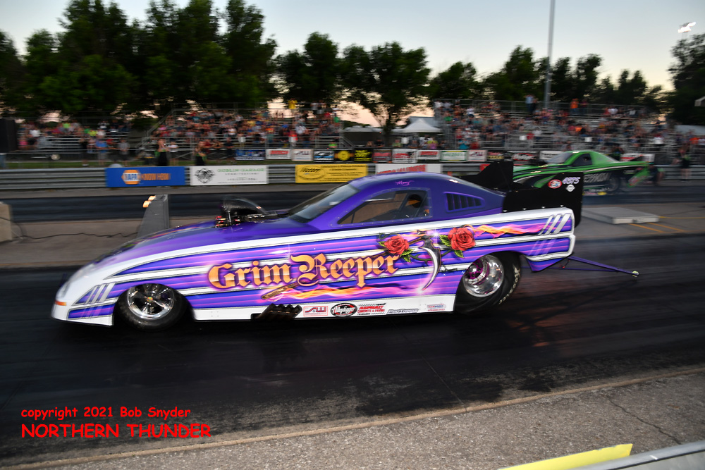 (LEFT) Making her series debut was Mary Reep in the flopper-bodied "Grim Reeper" after a decade or two of competing as an Outlaw Fuel Altered. She made her first passes count, finishing the day in the #7 spot on the list with a very good 4.096 - 181.97 pass to her credit