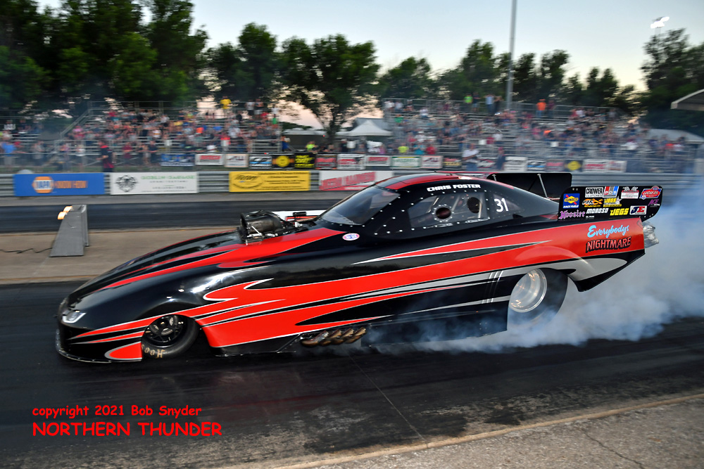 (LEFT) Coming out for his second shot at the track, Chris Foster in his black and red "Everybody's Nightmare" failed to improve on his earlier 4.342 - 129.80 clocking