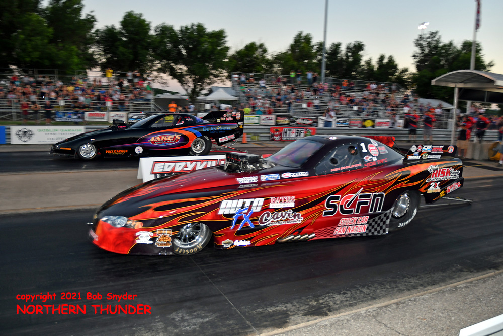 Closing out the "B" field eliminations, it was Jeff Cameron in his "Jake's Speed Shop" car (near lane) taking the win over Jeff Krug in "Obsession" (far lane)