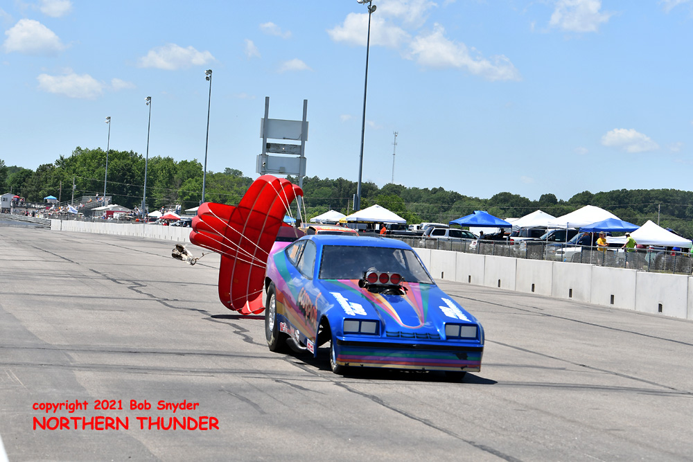 (LEFT) Adding insult to injury, Singleton's chutes came out late and he wound up going off the end of the track, but fortunately got it stopped before going into the trees. There was no damage to the car and they were able to get it ready for eliminations without any major stress