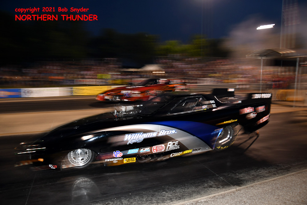 (RIGHT) Burning out before making his second qualifier, Kirk Williams in the "Williams Bros. Racing" entry stayed with his best of 3.732 - 200.62 and held down the #1 qualifying spot going into tomorrow's final qualifying session