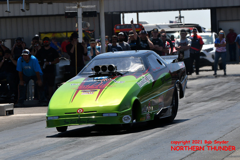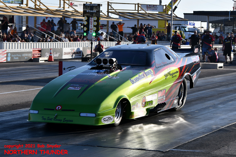 (LEFT) We're still getting used to the 2021 look of Steve Vang's new body, and the ever-changing car name which is currently "Wicked Weekender Racing". He ran a little slower than normal, only slotting in near the bottom of the provisional "B" field with a 4.442 - 134.90 effort