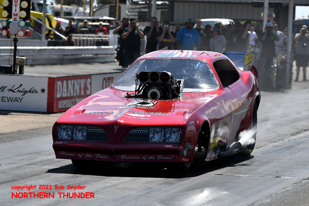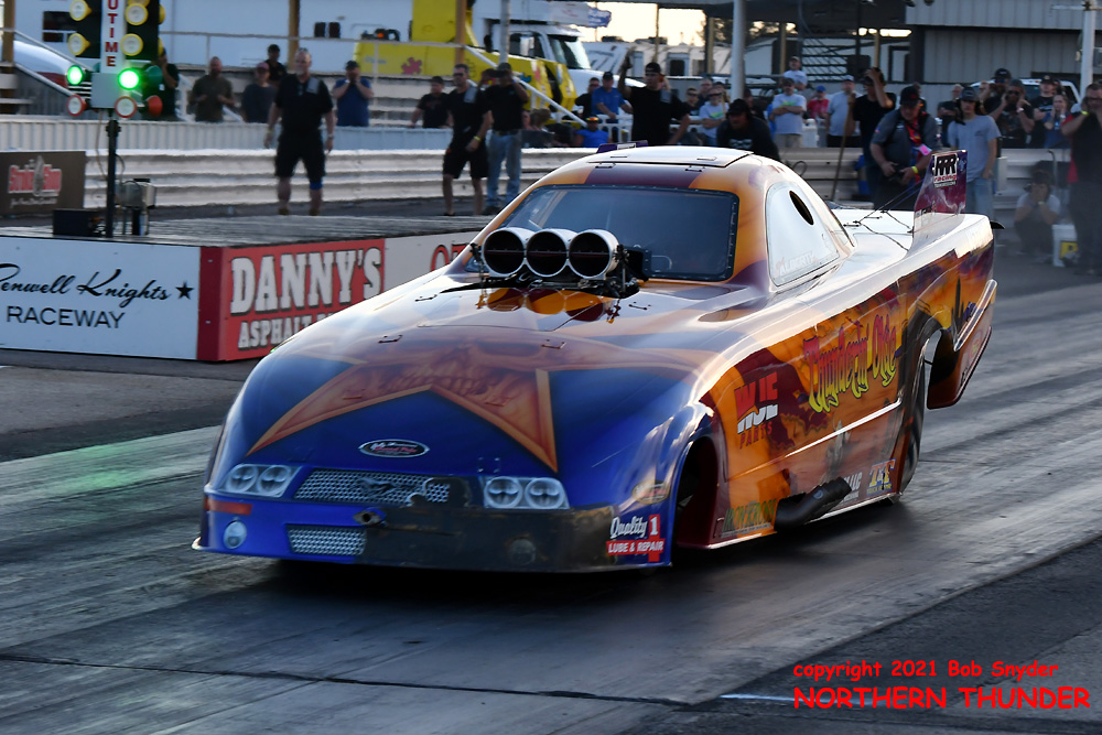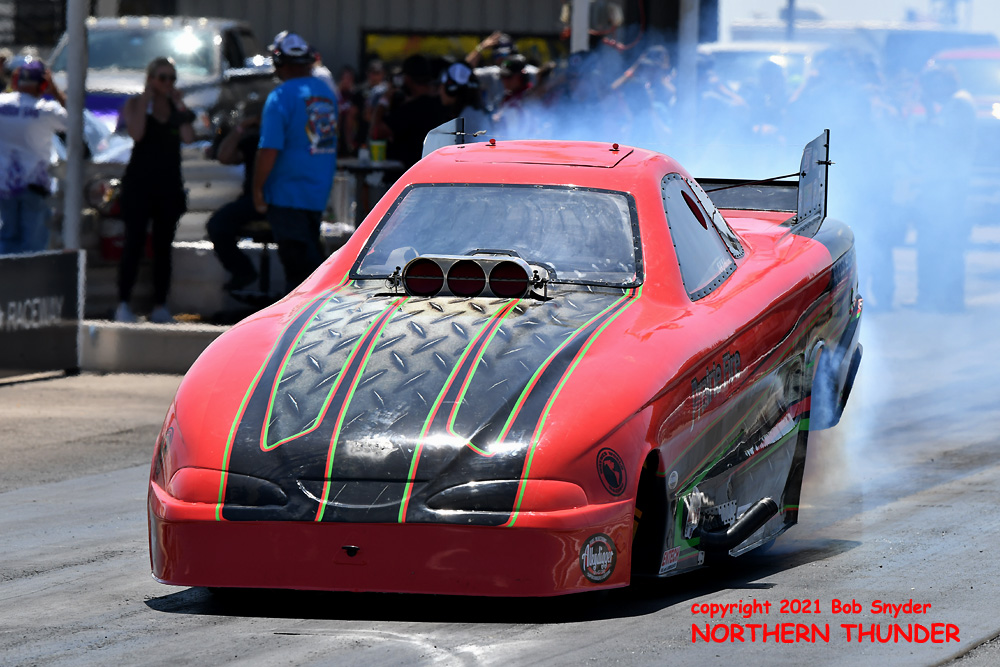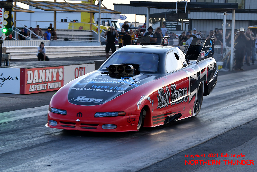 (RIGHT) The evening qualifying session came to a close with another pass by the "Red Baron" as new driver Jody Austin muscled it into the 3-second zone with a best of the day 3.985 - 178.50 for the #4 rung on the ladder