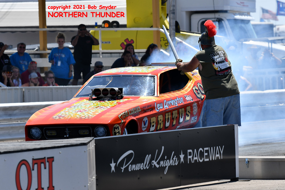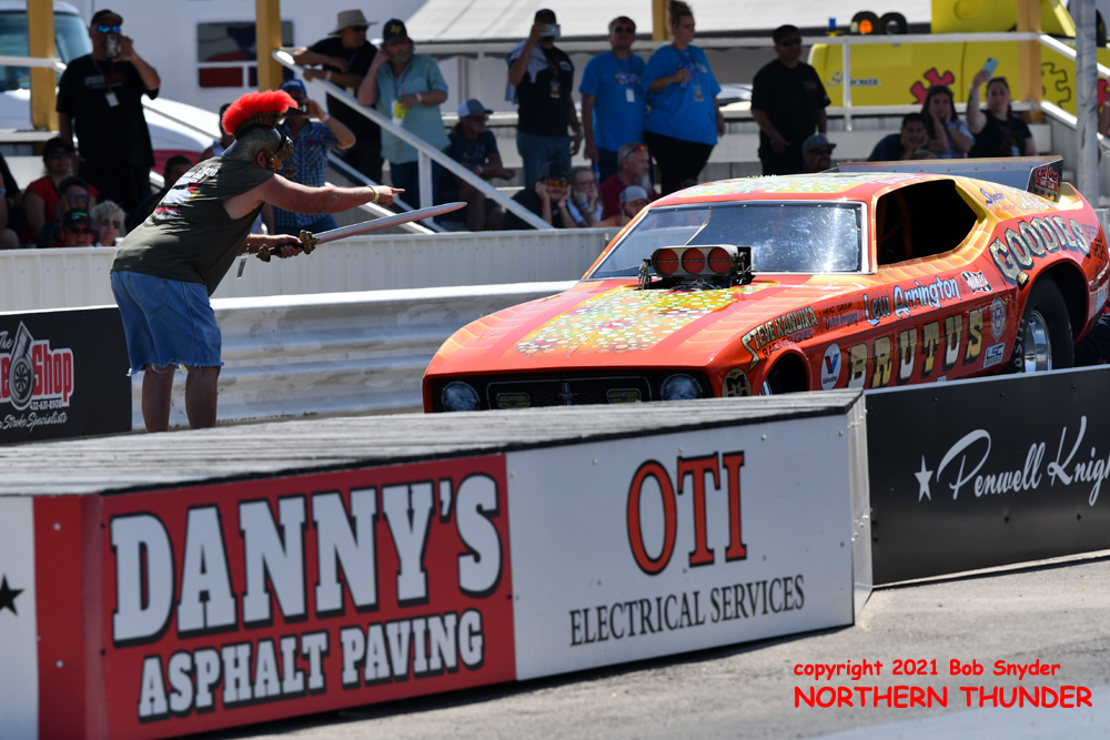 (RIGHT) This is something you don't see every day (thank goodness!) at the track, as a faux Roman Centurion appears to be threatening Chris Schneider to do a good burnout before his final qualifying pass